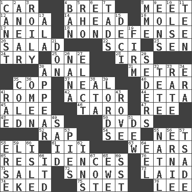ACROSS 1. 4-wheeled motor vehicle 4. Cy Young winner Saberhagen 8. Rendezvous 12. Small Philippine buffalo 14. Forward in time 16. Undercover agent 17. Famous astronaut Armstrong 18. Unrelated to defense, as in spending 20. First course 22. _-fi 23. Elected rep. 24. Attempt 25. Single 28. Big collection agency 30. Of or related to the anus 31. Distance measurement (Brit.) 35. Police officer (slang) 37. Actress Patricia 40. Letter starter 41. Play 42. Thespian 44. Singer James 45. Toward shelter 46. Pacific island yam 47. Portuguese money of account (variant) 48. Ferber et al. 50. Movie discs 52. Hit sharply and swiftly 54. Perceive with the eye 55. Remaining after all deductions 58. Biblical high priest 61. One more than two 63. Puts on (as clothing) 65. Dwellings 70. Inactive volcano in Sicily 71. Table seasoning 72. Frozen precipitation (plural) 73. Put down 74. Made supply last 75. Proofreading order 76. Area sheltered from the wind DOWN 1. 2nd pers. sing. pres. of can (arch.) 2. Approach 3. Agitated, as a liquid 4. Prohibit 5. 17th letter of the Greek alphabet 6. Car or cant ending 7. Bits 8. Madame (abbr.) 9. Immeasurably long periods of time 10. Otherwise 11. Adolescent 13. In the manner of 15. Tenth: prefix 19. Become taut 21. Spanish title 26. Grandmother 27. Opt 29. Spring feasts 30. Become visible 32. False hair 33. Assign a rank or rating to 34. Epoch 35. Lacking warmth 36. Presage 38. "One Day ___ Time" 39. Domineers 41. Actress Charlotte 43. Be footloose 49. Stated 51. Morning condensation 53. Sliced desserts 55. Brizilian seaport 56. Bert's buddy 57. Sadhe (variant) 58. Celtic language 59. Path through which fluid escapes 60. Small island 62. Restaurants 64. Snakelike fish 66. It would 67. Small bed 68. She-sheep 69. Fast jet (abbr.)