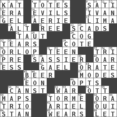 ACROSS 1. Krazy ___ of comics 4. Hauls 9. Suttee (variant) 13. Epoch 14. Vices 15. "Terrible" tsar 16. Set 17. Nest on high 18. Pale green bean 19. The first octave above the treble staff 21. Portuguese money of account (variant) 22. Tons 24. Pulled tight 26. Gear tooth 27. Rends 29. ____ d'Azur (French Riviera) 30. Lowest deck of a ship 31. Adolescent 33. Three (prefix) 36. Before (prefix) 37. More lively and spirited 40. Rowing implement 41. Double-curved letter 42. Highlander 43. Declaim 45. Fermented drink made from hops 47. Methods 48. A really long time 49. Chooses 50. 2nd pers. sing. pres. of can (arch.) 52. Armed conflict 54. Baseball player Mel 56. Atlas contents 57. Singer Mel 59. Mouth or opening 61. Musical group of three 62. Satellite of Uranus 63. Fr. "Yes" 64. Comedian Laurel of Laurel & Hardy 65. Erodes 66. Allow DOWN 1. Barrel 2. Type of rug 3. Baron Munchausen's specialties 4. Afternoon social gathering 5. Unconcealed 6. Become fatigued 7. Writer Wiesel 8. Compass dir. 9. Fodder prepared in a silo 10. Enthusiastic 11. Scottish caps 12. _ tizzy (2 wds.) 20. Edible starchy tuberous root 22. Biscuitlike quick bread 23. Small bed 25. United States Postal Service (abbr.) 27. Drink excessively 28. Blunders 29. To provide with a ceiling 31. Russian ruler of old 32. Compass dir. 33. Inedible or poisonous agaric 34. Assign a rank or rating to 35. Angers 38. Rep 39. Play 44. Printing process, for short 45. Gillaume's butler role 46. Greek goddess of the dawn 49. Abalone 50. Heavy open wagon 51. Capital of Western Samoa 52. Had on 53. Roberta Peters solo 55. Loyal 56. Mountains (abbr.) 57. The 23rd letter of the Hebrew alphabet 58. Raised railways 60. Small island