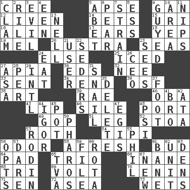 ACROSS 1. Algonquian 5. Domed church section 9. Separate the seeds from cotton 12. Make or become more lively 14. Antes 15. RI univ. 16. Place in a line 17. Hearing organs 18. Slangy assent 19. Cartoonist voice _ Blanc 20. A period of five years 23. Oceans 24. Otherwise 25. On the rocks 27. Capital of Western Samoa 30. Begley and Asner 32. Born 33. Emitted 34. Tear apart 36. Order of Saint Francis (abbr.) 38. Tate display 39. Actress Charlotte 40. Chief or king in Benin or Nigeria 43. Mouth edge 46. Filth; sediment 48. Sweet dark-red dessert wine 49. Republican Party 51. Part of a journey 52. Portico 53. Writer of Portnoy's Complaint (1969) 54. Native american tent (variation) 56. Scent 58. Anew 61. Partially opened flower 64. Groovy apt. 65. Musical group of three 66. Lacking in sense or substance 68. Three (prefix) 69. Electrical Unit 70. Soviet premier 1918-24 71. Elected rep. 72. Toward the sea 73. Soaks DOWN 1. Dollar (slang) 2. Cause heat under the collar 3. Morally bad or wrong 4. Car or cant ending 5. Collude with 6. Lightbulb-shaped fruit 7. Put through a sieve 8. Double-curved letter 9. Secured 10. Type of rug 11. Cuts off 13. 1994 drama film starring Jodie Foster 21. One who uses or employs something 22. Spring feasts 23. Observes 24. Consume 26. Corporate head (abbr.) 27. White ___ sheet 28. For each 29. International (abbr.) 31. Slow-paced one 35. Erase 37. Pick up the tab 41. Sis' sibling 42. _ moment's notice (2 wds.) 44. Composer Stravinsky 45. Plant holder 47. Armor plate that protects the chest 48. 23rd letter of the Greek alphabet 50. N Egypt peninsula 53. "The Thinker" sculptor 55. Silvers or Donahue 56. Elects 57. Have the gumption 59. Do some clerical work 60. Round or rotation of duties 61. Object of repulsion 62. A single undivided whole 63. Cub Scout units 65. Federal power corp. 67. ___ Haven, CT