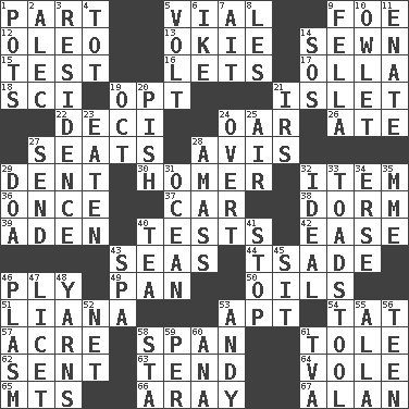 ACROSS 1. Component 5. Small bottle 9. Enemy 12. Margarine 13. Migrant worker of the '30s 14. Stitched 15. Trial 16. Allows 17. Rounded earthenware pot or jar 18. _-fi 19. Choose 21. Small island 22. Tenth: prefix 24. Rowing implement 26. Had dinner 27. Theater features 28. Advice 29. Undesirable depression on a surface 30. Homing pigeon 32. Detail 36. Single time 37. 4-wheeled motor vehicle 38. Dormintory (informal) 39. Arabian gulf 40. Trials 42. Comfort 43. Oceans 44. Sadhe (variant) 46. Strand of rope, yarn or thread 49. Baking dish 50. Lubricates 51. Climbing, woody, usually tropical vines 53. Fitting 54. Make lace 57. Measure of real estate 58. Connect, as a bridge 61. Lacquered or enameled metalware 62. Transmitted 63. Look after 64. Short-tailed, large-bodied rat 65. Mountains (abbr.) 66. Like ___ of sunshine 67. ____ Jay Lerner DOWN 1. Plant holders 2. Actor Baldwin 3. Home 4. Small child 5. Electrical Unit 6. Mamie's husband 7. Small island 8. French article 9. Chap (slang) 10. A small or young owl 11. Maternal 14. Distress signal 19. Sep. follower 20. Expression of disdain 21. Big collection agency 23. Ingested 24. Unconcealed 25. Wind 27. Post 28. Collect or gather 29. ___ good deed 31. Sea 32. Standard of perfection 33. Inedible or poisonous agaric 34. Celtic language 35. Madame (abbr.) 40. Afternoon social gathering 41. Halt 43. Health resort 45. Be seated 46. Suffix with ecto or cyto 47. It is permitted: Lat. 48. Tall tales 52. Fish or hair follower 53. Actor Griffith 55. Silent film actress Nazimova 56. Adolescent 58. R.R. building 59. For each 60. Santa ___, CA 61. Federal power corp.