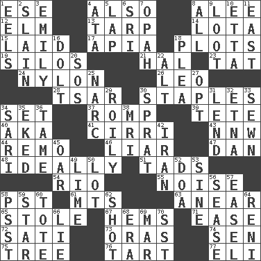 ACROSS 1. Compass dir. 4. In addition 8. Toward shelter 12. Shade tree 13. Canvas cover 14. Globular water bottle used in Asia 15. Put down 17. Capital of Western Samoa 18. Schemes 19. Grain storage towers 21. Actor Linden 23. Make lace 24. Thermoplastic polyamide 26. Lion 28. Russian ruler of old 30. Paper fasteners 34. Put into a specified state 37. Play 39. Wig 40. Alias (abbr.) 41. High-altitude cloud 43. Compass dir. 44. San ____ (Riviera town) 46. One who doesn't tell the truth 47. One of the 12 tribes of Israel 48. Under perfect conditions 51. Bits 54. _ de Janeiro 55. Annoying sound 58. Pacific Standard Time (abbr.) 61. Mountains (abbr.) 63. Approach 65. Fur scarf 67. Is hesitant and indecisive 71. Relaxation 72. Suttee (variant) 73. Mouths or openings 74. Elected rep. 75. Family _ (genealogy) 76. Small pie 77. Biblical high priest DOWN 1. Snakelike fish 2. Killed 3. Poet Dickinson 4. _ moment's notice (2 wds.) 5. Infant locale 6. _ Lanka 7. Brightly colored fish 8. Everything 9. Plunder 10. Singer James 11. 90 degrees 16. Stupid person 18. Entreaty 20. Distress signal 22. Keyboard modifier key 25. Drug cop 27. Choose 29. Agitated, as a liquid 30. Small fatty European fish 31. Grant temporary use of 32. Inactive volcano in Sicily 33. Stitched 34. Indian skirt 35. Supplemented with great effort 36. Docile 38. Medical imaging device (abbr.) 42. SW Asia republic 45. Rowing implement 49. Citrus frut 50. Car dealer's back yard 52. ___ good deed 53. Trig term 56. Gospel singer Marvin 57. Artist's stand 58. Inconspicuous attention getter 59. Play the lead 60. Haul 62. Attempt 64. Painter Guido (1575-1642) 66. Untruth 68. Period 69. Make imperfect 70. Fast jet (abbr.)