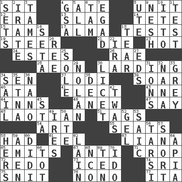 ACROSS 1. Be seated 4. Yard entry 8. A single undivided whole 12. Period 13. Volcanic refuse 14. Wig 15. Scottish caps 17. _ mater 18. Trials 19. Bull 21. Expire 23. Being at a high temperature 24. _____ Park, CO 26. Actress Charlotte 28. A really long time 30. Preparing or cooking with lard 34. Elected rep. 37. Farming town in central California 39. Fly high 40. _ moment's notice (2 wds.) 41. Choose 43. Compass dir. 44. Restaurants 46. Afresh 47. Declare 48. Of or relating to Laos or its people 51. Labels 54. Nonscientific branch of learning 55. Theater features 58. Possessed 61. Snakelike fish 63. Woody, climbing, usually tropical plant 65. Sends forth 67. Opposed to 71. Riding implement 72. Do over again 73. On the rocks 74. _ Lanka 75. In a ____ (agitated or irritated) 76. Words to Nanette 77. Call ___ day DOWN 1. Puts into a specified state 2. Feeling or showing extreme anger 3. Domesticates 4. Girls' org. (abbr.) 5. Everything 6. Scottish cap 7. Mild oath 8. Shoshoni 9. Soft 10. "Tell ____ the Marines!" 11. Trial 16. Bristle 18. Separate forcefully 20. To sift 22. Lyricist Gershwin 25. Flatfish 27. Begley and Asner 29. Pitcher Ryan 30. It is permitted: Lat. 31. Charged particles 32. Grandmother 33. Jennifer or Joel 34. Travel by water 35. Inactive volcano in Sicily 36. Billionth: prefix 38. Lair 42. It was, poetically 45. R.R. building 49. Angers 50. Had dinner 52. Set 53. Ketch in the Levant 56. Tarsus (plural) 57. Derisive sound 58. Possessive pronoun 59. So be it 60. "You Light Up My Life" star Conn 62. (Had) reclined 64. Capital of Western Samoa 66. Small child 68. Non-commissioned officer (abbr.) 69. "___ Little Indians" 70. Wedding promise