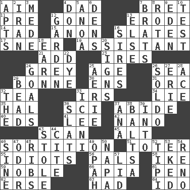ACROSS 1. Direct toward a target or goal 4. June honoree 7. Cy Young winner Saberhagen 11. Before (prefix) 12. Went 13. Eat (away) 14. Small amount or degree 15. Soon (poet.) 16. Chalkboards 17. Contemptuous expression 19. Aide 21. Say or write further 23. Angers 24. Jennifer or Joel 25. Grow older 26. Ocean 29. Maid-servant 30. Followers of ems 31. The grampus (Milton) 32. Beverage made from leaves 33. Big collection agency 34. Whopper 35. Actor Linden 36. _-fi 37. Tolerate 40. Begley and Asner 41. Area sheltered from the wind 42. Billionth: prefix 43. Examine hastily 45. The first octave above the treble staff 46. Casting lots 51. Carrier 55. Foolish or stupid persons 56. Friends 58. Eisenhower's nickname 59. Having high moral qualities 60. Capital of Western Samoa 61. Fenced enclosure 62. Celtic language 63. Possessed 64. Wedding promise DOWN 1. Tenement units (abbr.) 2. SW Asia republic 3. Ancient Persian 4. Spanish title 5. Small Philippine buffalo 6. Lairs 7. Naughty children 8. Roll call or roster of names 9. Locale of original sin 10. Trial 12. Place where plants grow 13. Otherwise 16. Founders of families 18. Merit 20. Signals 22. Color 24. Scores awarded for successful feats 25. Nest on high 26. Twentieth part of a lira 27. One of the Great Lakes 28. Adept person 29. Necklace unit 32. Definite Article 33. Ancient Celtic tribe of eastern Britain 36. Narrow boards 37. Santa ___, CA 38. Greek mezzo-soprano Agnes 39. To the inside or interior of 43. Took without asking 44. Quote 46. Trig term 47. Aroma 48. Chest bones 49. Brightly colored fish 50. California wine valley 52. Native american tent (variation) 53. Made supply last 54. Former U.S. Attorney General Janet 57. Flaplike covering