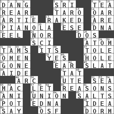 ACROSS 1. Mild oath, euphamism for damn 5. Indian title of respect (Mr.) 8. Afternoon social gathering 11. Tail end 12. Edible starchy tuberous root 14. Rowing implement 15. Nick name for Arthur 17. Swept the length of 18. "We ___ not amused" (Victoria) 19. Player piano 21. Compass dir. 22. Heredity factor (abbr.) 23. Snakelike fish 24. Not either 25. Two (Sp.) 27. _-fi 28. Smallest unit of an element 31. Scottish caps 35. ___ a Wonderful Life 37. Lacquered or enameled metalware 38. Sign of something about to happen 39. Consenting reply 41. Opening into or through something 42. Went 43. Hearing organ 45. Narrow board 46. Assistant 47. Make lace 49. Curve 51. Shoshoni 52. Ocean 55. Apple computer (short form) 57. Allow 60. Thinks logically 62. Black tropical American cuckoo 63. The state of being joined or united 65. Table seasonings 66. Plant holder 67. Pulitzer Prize-winning author Ferber 68. It may be bright or harebrained 69. Declare 70. Order of Saint Francis (abbr.) 71. Dormintory (informal) DOWN 1. Window treatment 2. Nest on high 3. Relating to or accompanying birth 4. Smile widely 5. R.R. building 6. Libertine 7. Angers 8. Inedible or poisonous agaric 9. Merit 10. Length times width 13. Wrote a lyric poem 16. Immeasurably long periods of time 17. Noteworthy scarcity 20. Event scenes 26. Expletives 29. Spanish pot 30. Confront 31. Ancient Roman robe 32. Mine, in Marseilles 33. Ananias' fault 34. Contemptuous expression 36. Perceive with the eye 40. Titan orbits this 44. Pace 48. Beverages made from leaves 50. A slight indication 52. Twentieth part of a lira 53. Keyboard key 54. Indian state 55. Atlas contents 56. Small Philippine buffalo 58. Inside; within (prefix) 59. Metal containers 61. Expressed in words 64. Clumsy lout