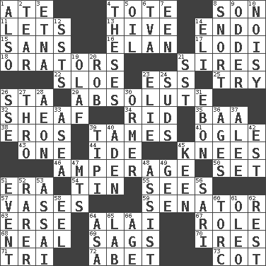 ACROSS 1. Had dinner 4. Carry 8. Male child 11. Allows 13. Hub of activity 14. Inside; within (prefix) 15. Without 16. Enthusiasm 17. Farming town in central California 18. Speakers 21. Founders of families 22. A type of plum 23. Curvy letter 25. Attempt to accomplish something 26. R.R. building 29. Utter; complete 32. Bundle of cut stalks of grain 34. To free from 35. Sound made by sheep 38. Greek god of love 39. Makes less strong or intense 41. Stare 43. Single 44. Binary compound 45. Leg joints 46. Electrical Measurement 50. Arrange properly for use 51. Epoch 54. Metal container 55. Perceives with the eye 57. Flower holders 59. Elected representative 63. Celtic language 64. Jai ____ 67. Hero or heavy, e.g. 68. Be tempered by heat 69. Settles 70. Angers 71. Three (prefix) 72. Collude with 73. Small bed DOWN 1. In addition 2. Pull apart 3. Inactive volcano in Sicily 4. College papers 5. Lubricate 6. Federal power corp. 7. Car or cant ending 8. Derisive sound 9. More peculiar 10. Annoyingly loud 12. Fast planes 14. Connecticut Ivy Leaguer 19. Norwegian king 20. Director Reiner 21. Fast jet (abbr.) 23. Writer Wiesel 24. Beer foam 26. Compass dir. 27. Through, poetically 28. A really long time 30. Abalone 31. Inky black, to poets 33. At sea 36. Ripens 37. Toward shelter 39. Native american tent (variation) 40. An important port of Yemen 42. Eastern Standard Time (abbr.) 45. Peachy ____! 47. Mountains (abbr.) 48. Aid 49. Turn to the right 51. Incident 52. Less widely known 53. Slender Brazilian palm 56. Indian skirt 58. Snakelike fish 60. Torque (variant) 61. Butter sub 62. Repose 64. White ___ sheet 65. Experiment locale 66. Grow older