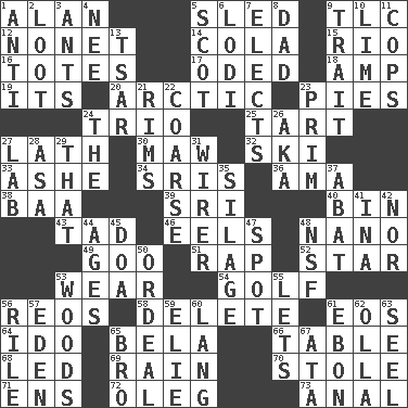 ACROSS 1. ____ Jay Lerner 5. Downhill vehicle 9. Affectionate concern, for short 12. Music written for nine 14. Root beer relative 15. River (Sp.) 16. Lugs 17. Wrote a lyric poem 18. Electrical Unit 19. It is 20. Northern region 23. Sliced desserts 24. Musical group of three 25. Small pie 27. Thin strip of wood or metal 30. Opening into something insatiable 32. What Jean-Claude Killy likes to do 33. American tennis player Robert 34. Indian titles of respect 36. Wet nurse (var.) 38. Sound made by sheep 39. Indian title of respect (Mr.) 40. Storage container 43. Small boy 46. Snakelike fish 48. Billionth: prefix 49. Thick or sticky substance 51. Strike 52. Play the lead 53. Erode 54. _ course 56. Vintage cars 58. Keyboard key 61. Greek goddess of the dawn 64. Wedding promise 65. Actor Lugosi 66. Eating place 68. Directed 69. Water falling in drops from the sky 70. Took without asking 71. Followers of ems 72. Cassini of fashion 73. Of or related to the anus DOWN 1. Opposed to 2. Spoils 3. Pismires 4. Born 5. Highlander 6. Farming town in central California 7. Opts 8. June honoree 9. Distinguishing feature 10. Citrus frut 11. 911 reaches them 13. Russian ruler of old 21. Basketball hoops 22. Rough 23. Demure 24. Definite Article 26. Alias (abbr.) 27. Experiment locale 28. White ___ sheet 29. Not this but _ 31. One who wires 35. Fodder prepared in a silo 37. Blind as ____ 41. _ tizzy (2 wds.) 42. Not either 44. Ripens 45. ___ good deed 47. Specific locale 48. Overdraft (abbr.) 50. Severe or trying experience 53. Forest 55. Allows 56. Cause heat under the collar 57. Genesis locale 59. Writer Wiesel 60. Austrian-born American filmmaker Fritz 61. Inky black, to poets 62. Rounded earthenware pot or jar 63. Stitch closed the eyes of (a falcon) 65. Sis' sibling 67. _ moment's notice (2 wds.)