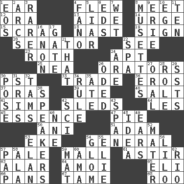 ACROSS 1. Hearing organ 4. Soared 8. Rendezvous 12. Mouth or opening 13. Assistant 14. Goad 15. Strangle with an iron collar 18. Political cartoonist Thomas 19. Omen 20. Legislator 22. Perceive with the eye 23. Writer of Portnoy's Complaint (1969) 24. Fitting 25. Teachers' org. 26. Speakers 30. Pacific Standard Time (abbr.) 33. Swap 36. Greek god of love 37. Mouths or openings 39. Shoshoni 40. Table seasoning 41. Simple or foolish person 42. Bobsleighs 44. French article 45. Gist 47. Sliced dessert 50. Cuckoo 51. First of billions? 53. Make supply last 54. Commissioned military rank 57. Light colored 59. Promenade 61. Moving or stirring 63. Having or resembling wings 64. Mine, in Marseilles 65. Connecticut Ivy Leaguer 66. Zero-star reviews 67. Not wild 68. Friend of Pooh DOWN 1. Greek goddess of the dawn 2. Arches 3. More uncommon 4. Papal veil 5. One who doesn't tell the truth 6. Begley and Asner 7. Soggy 8. French bagpipes 9. One of the Great Lakes 10. Ovum 11. Nine, plus one 16. Soon (poet.) 17. Yard entry 21. Not this but _ 22. Health resort 24. "We ___ not amused" (Victoria) 26. Wrote a lyric poem 27. Spoken 28. Hero or heavy, e.g. 29. Fast planes 30. Introduce or present, as a question 31. Indian titles of respect 32. Scottish caps 34. Governing power 35. Had dinner 38. Orators 42. _-fi 43. Connect, as a bridge 46. Compass dir. 48. The main thing one is thinking about 49. Hearing organs 52. Mother 53. Flair 54. Seize upon or latch onto something 55. Writer Wiesel 56. _ and Stitch 57. Infant food 58. Chicken ___ king 59. Floor protector 60. Housemaid (var.) 62. _ de Janeiro