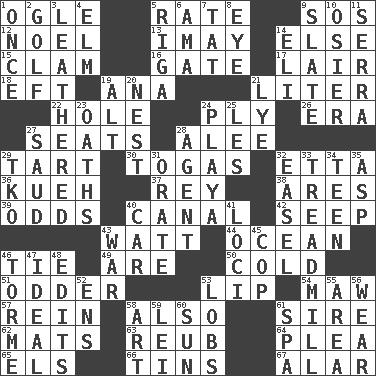 ACROSS 1. Stare at amorously 5. Assign a rank or rating to 9. Mayday 12. Christmas carol 13. "If ____ say so..." 14. Otherwise 15. Dollar (slang) 16. Yard entry 17. Den 18. Newt 19. Santa ___, CA 21. 61 cubic inches 22. Opening into or through something 24. Apply oneself diligently 26. Period 27. Theater features 28. Toward shelter 29. Small pie 30. Ancient Roman robes 32. Singer James 36. Malaysian steamed pastry 37. Marina Del _, California 38. Ancient Greek god of war 39. Likelihood 40. Lessep's creation 42. Ooze 43. Electrical Unit 44. Sea 46. Neckwear 49. "We ___ not amused" (Victoria) 50. Lacking warmth 51. More peculiar 53. Mouth edge 54. Informal term for the mouth 57. It's straight from the horse's mouth 58. In addition 61. Beget 62. Floor coverings 63. Reuben's nickname 64. Entreaty 65. Raised railways 66. Canisters 67. Having or resembling wings DOWN 1. Single time 2. Eighteen holes 3. Tough but pliablecoriaceous 4. Shade tree 5. Port city in Latvia 6. Nursemaid (var.) 7. Make lace 8. Sight organ 9. Schedule 10. Flexible twig of a willow tree 11. Father Junipero _ 14. Biblical high priest 19. The first octave above the treble staff 20. A home for chicks 21. Sodium hydroxide 23. Expletives 24. Beach, in Buenos Aires 25. French article 27. Saudi Arabian king (1953-1964) 28. Representative 29. Ring climax 31. Declaim 32. Artist's stand 33. Excercise machine 34. Adolescent 35. Cleo's killer 40. Auto 41. Locales 43. Armed conflict 45. Police officer (slang) 46. Singer Mel 47. Standard of perfection 48. Proofreads 52. Followers of ems 53. Tennis shots 55. Length times width 56. Erode 58. Tate display 59. Luau accessory 60. Player for Phoenix 61. Health resort