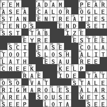 ACROSS 1. Opposite of masc. 4. First man 8. Lightbulb-shaped fruit 12. At sea 14. Bodily heat indicating an inflammation 16. Stare at amorously 17. Comedian Laurel of Laurel & Hardy 18. Pleas 20. Watches over 22. Conclude 23. Arrange properly for use 24. Fast jet (abbr.) 25. Keyboard key 28. Ending with capital 30. Jane of fiction 31. First name in cosmetics 35. _-fi 37. Relaxation 40. Root beer relative 41. A blast of a horn 42. Agitate, as a liquid 44. Set down 45. Thin strip of wood or metal 46. Son of Isaac 47. To sift 48. Small stream 50. Seaweed 52. Actress Charlotte 54. Binary compound 55. Make lace 58. Bear (Spanish) 61. Large container 63. Having lost freshness 65. Complicated, petty procedures 70. Having or resembling wings 71. Type of rug 72. Lush 73. Soaks 74. Ooze 75. Globular water bottle used in Asia 76. Observe DOWN 1. Goes without food and/or water 2. _____ Park, CO 3. Intended 4. Adept person 5. One of the 12 tribes of Israel 6. The first octave above the treble staff 7. Greater amount 8. Plant holder 9. Armor plate that protects the chest 10. Toward shelter 11. State of inaction 13. Also 15. Painter Guido (1575-1642) 19. Axlike tool, used for shaping wood 21. Filthy place 26. Ancient Greek god of war 27. Memphis, Tenn. Street 29. Fortification 30. One or the other 32. Lacquered or enameled metalware 33. Writer Wiesel 34. Consume 35. Fly high 36. ____ d'Azur (French Riviera) 38. Distress signal 39. 1973 Nobel Price Winner (Physics) Leo 41. Affectionate concern, for short 43. Took on color 49. Polynesian shrub of the pepper family 51. French article 53. Hearing organs 55. Lies 56. Having winglike extensions 57. Laconic 58. Mouths or openings 59. Male parent of an animal 60. Double curve, resembling the letter S 62. Instrument 64. The 23rd letter of the Hebrew alphabet 66. Atlas unit 67. Nilotic language 68. Eastern Standard Time (abbr.) 69. Ocean
