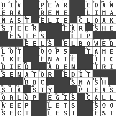 ACROSS 1. HTML Container Element 4. Lightbulb-shaped fruit 8. Dutch treat 12. Period 13. French philosopher Descartes 14. Pale green bean 15. Political cartoonist Thomas 17. Writer Wiesel 18. Anything that covers or conceals 19. Guide 21. At a great distance 23. A female animal or person 24. _____ Park, CO 26. Mouth edge 28. Snakelike fish 30. Turned at an angle; bent 34. Car dealer's back yard 37. I made a mistake 39. Docile 40. D.D.E's nickname 41. Related on the mother's side 43. Nervous spasm 44. Passed on 46. Arabian gulf 47. Three (prefix) 48. Elected representative 51. Prepare for publication 54. English channel? 55. Box-office sellout 58. R.R. building 61. Filthy place 63. Entreaties 65. Lowest deck of a ship 67. The front part of a cuirass 71. Give a ring to 72. Shed a tear 73. Allows 74. "Barney Miller" actor Jack 75. Religious group 76. For fear that 77. Eastern Standard Time (abbr.) DOWN 1. Lairs 2. Feeling or showing extreme anger 3. Flower holders 4. Before (prefix) 5. Snakelike fish 6. Black tropical American cuckoo 7. Coral collection 8. Pipe bend 9. "Vaya con ____" 10. Housemaid 11. Create 16. False hair 18. Baby bed with high sides 20. Portuguese money of account (variant) 22. 100% 25. _ gin 27. Cooking vessel 29. Echolocation 30. First name in cosmetics 31. Electrical Unit 32. Independent ruler or chieftain 33. Tenth: prefix 34. Hats (slang) 35. Migrant worker of the '30s 36. Adolescent 38. Groovy apt. 42. Extremities 45. Small moist lump or mass 49. Cook's measure (abbr.) 50. Sep. follower 52. Naughty child 53. Baby powder 56. Gospel singer Marvin 57. Rings 58. Sty mamas 59. Woody plant 60. Actor Baldwin 62. Shout 64. Narrow opening 66. Elect 68. Unit of force equal to gravity 69. It is 70. Fast jet (abbr.)