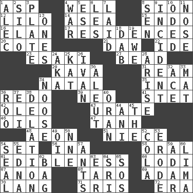 ACROSS 1. Viper 4. Not ill 8. The Jewish people; Israel 12. _ and Stitch 14. Toward the sea 15. Inside; within (prefix) 16. Enthusiasm 17. Dwellings 20. ____ d'Azur (French Riviera) 21. Simpleton 22. Binary compound 23. 1973 Nobel Price Winner (Physics) Leo 27. Necklace unit 29. Polynesian shrub of the pepper family 31. 480, 500 or 516 sheets of paper 34. Relating to or accompanying birth 35. South American Indian 36. Redecorate 39. Modern: prefix 41. Proofreading order 42. Butter sub 43. A salt of uric acid 46. Lubricates 47. Hyperbolic tangent 48. Period of immesurable duration 51. Sibling's daughter 54. Arrange properly for use 56. _ tizzy (2 wds.) 58. Relating to the mouth 61. The property of being fit to eat 66. Farming town in central California 67. Small Philippine buffalo 68. Edible starchy tuberous root 69. First man 70. Austrian-born American filmmaker Fritz 71. Indian titles of respect 72. Epoch DOWN 1. Actor Baldwin 2. Grain storage tower 3. Food holder 4. Armed conflict 5. Compass dir. 6. French article 7. Put down 8. Elected rep. 9. Event 10. Wrote a lyric poem 11. Olfactory organ 13. Singles 18. Apply (a substance) by light strokes 19. She-sheep 24. Alias (abbr.) 25. Krazy ___ of comics 26. _ the terrible 28. Originate 30. Native American of Southwest Alaska 32. Adept person 33. Floor protector 34. Trap for birds or small mammals 36. Friend of Pooh 37. Connecticut Ivy Leaguer 38. Conveyance 40. Northwest Algerian city 44. Black tropical American cuckoo 45. Definite Article 49. Lubricate 50. Compass dir. 52. Root beer relative 53. Eat (away) 54. Lick closed 55. Pulitzer Prize-winning author Ferber 57. Pismires 59. The sixth month of the Jewish calendar 60. Pale green bean 62. Container for groceries 63. Ewer handle 64. _ Lanka 65. Distress signal