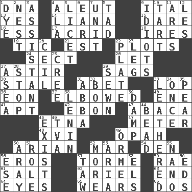 ACROSS 1. Heredity factor (abbr.) 4. Native American of Southwest Alaska 9. Slanted text style (abbr.) 13. It is so 14. Woody, climbing, usually tropical plant 15. Have the gumption 16. Curvy letter 17. Bitter 18. Angers 19. Nervous spasm 21. Eastern Standard Time (abbr.) 22. Graphs 24. Religious group 26. Allow 27. Moving about 29. Sinks 30. Having lost freshness 31. Collude with 33. Chop off 36. A really long time 37. Turned at an angle; bent 40. Compass dir. 41. Fitting 42. Inky black, to poets 43. Phillipine bananalike plant 45. Inactive volcano in Sicily 47. Distance measurement 48. 16 49. Brightly colored fish 50. Believer in; advocate of (suffix) 52. Spoil 54. Lair 56. Greek god of love 57. Singer Mel 59. Actress Charlotte 61. Table seasoning 62. Satellite of Uranus 63. Conclusion 64. Sight organs 65. Erodes 66. Two (Sp.) DOWN 1. Color 2. A home for chicks 3. Aide 4. Chicken ___ king 5. It is permitted: Lat. 6. Hearing organs 7. A single undivided whole 8. Small amount or degree 9. Foolish or stupid persons 10. Small pie 11. Ancient Greek god of war 12. French article 20. To provide with a ceiling 22. Food holder 23. Part of a journey 25. Algonquian 27. Toward the sea 28. Close up, plug up 29. Stitched 31. Swedish rock group 32. Sometimes accompanies a hiss 33. Tough but pliablecoriaceous 34. At one time in the past 35. Lightbulb-shaped fruit 38. Soviet premier 1918-24 39. Moist 44. Necklace unit 45. Is 46. Federal power corp. 49. Abalone 50. Like ___ of sunshine 51. Hero or heavy, e.g. 52. Greater amount 53. Operatic vocal solo 55. Billionth: prefix 56. Compass dir. 57. The 23rd letter of the Hebrew alphabet 58. Raised railways 60. Begley and Asner
