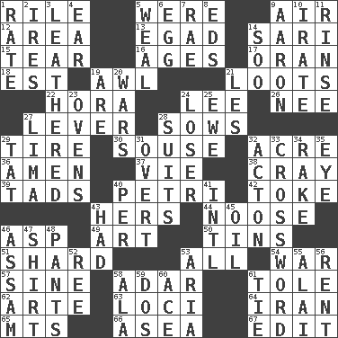 ACROSS 1. Cause heat under the collar 5. We are 9. Wind 12. Length times width 13. Mild oath 14. Indian skirt 15. Pull apart 16. Ripens 17. NW Algerian seaport 18. Eastern Standard Time (abbr.) 19. Leather borer 21. Plunders 22. Israeli folk dance 24. Area sheltered from the wind 26. Born 27. Prying instrument 28. Sty mamas 29. Become fatigued 30. Lush 32. Land measure 36. So be it 37. Compete 38. Supercomputer manufacturer 39. Small boys 40. _ dish (used to culture cells) 42. Casino tip 43. Possessive pronoun 44. Trap for birds or small mammals 46. Viper 49. Nonscientific branch of learning 50. Canisters 51. Pottery fragment 53. 100% 54. Armed conflict 57. Trig term 58. The sixth month of the Jewish calendar 61. Lacquered or enameled metalware 62. Johnson of "Laugh-In" 63. Locales 64. SW Asia republic 65. Mountains (abbr.) 66. At sea 67. Prepare for publication DOWN 1. Assign a rank or rating to 2. Angers 3. Resembling or made to resemble leather 4. Ewer handle 5. Welt 6. Ovum 7. Actress Charlotte 8. Begley and Asner 9. Composer Copland 10. Feeling or showing extreme anger 11. Remove soap 14. "Barney Miller" actor Jack 19. "We ___ not amused" (Victoria) 20. Armed conflicts 21. French article 23. Baking chambers 24. Failure 25. She-sheep 27. Pale green bean 28. Sets or collections 29. Make lace 31. Unconcealed 32. 13-14th century defensive garment 33. What you're doing now 34. Immoral or dissolute person 35. Sight organ 40. For each 41. International (abbr.) 43. Possessed 45. Petroleum 46. Indian state 47. Chest covering 48. Leg coverings 52. To sift 53. Roberta Peters solo 55. Mountain range southwest of Kyrgyzstan 56. Monthly bill 58. Wing 59. Two (Sp.) 60. Adept person 61. Make a knot