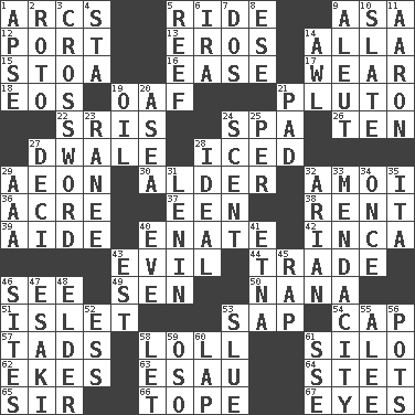 ACROSS 1. Arches 5. Travel on an animal 9. White ___ sheet 12. Left side of a ship or aircraft 13. Greek god of love 14. Silent film actress Nazimova 15. Portico 16. Relaxation 17. Erode 18. Greek goddess of the dawn 19. Clumsy lout 21. Greek god of the underworld 22. Indian titles of respect 24. Health resort 26. "___ Little Indians" 27. A sleeping potion; an opiate (poet.) 28. On the rocks 29. Period of immesurable duration 30. Tree or shrub in the Birch family 32. Mine, in Marseilles 36. 43,560 square feet 37. Car or cant ending 38. Monthly bill 39. Helper 40. Maternal 42. South American Indian 43. Tending to cause great harm 44. Exchange 46. Observe 49. Elected rep. 50. Nanny 51. Small island 53. Plant excrement 54. Head covering 57. Small boys 58. Hang loosely or laxly 61. Grain storage tower 62. Supplements with great effort 63. Son of Isaac 64. Proofreading order 65. Title for a knight 66. Drink excessively 67. Snake ____ (dice throw) DOWN 1. Domed church section 2. Printing process, for short 3. What you're doing now 4. R.R. building 5. Coral ridge 6. Lyricist Gershwin 7. Two (Sp.) 8. Compass dir. 9. Native American of Southwest Alaska 10. Schedule 11. Composer Copland 14. Leather borer 19. Lubricate 20. Toward the sea 21. Groovy apt. 23. Indian princess (variant) 24. Odor 25. For each 27. Tenth: prefix 28. Perfect 29. American Automobile Association (abbr.) 31. Soviet premier 1918-24 32. Believer in; advocate of (suffix) 33. Ananias' fault 34. Single time 35. Call ___ day 40. First lady 41. Inactive volcano in Sicily 43. Eastern Standard Time (abbr.) 45. Reproach for some lapse or misdeed 46. Locates 47. 1973 Nobel Price Winner (Physics) Leo 48. A person who is older than you are 52. Curvy letter 53. Turn sharply 55. Toward shelter 56. Cooking vessels 58. Allow 59. Bear (Spanish) 60. Infant locale 61. Compass dir.