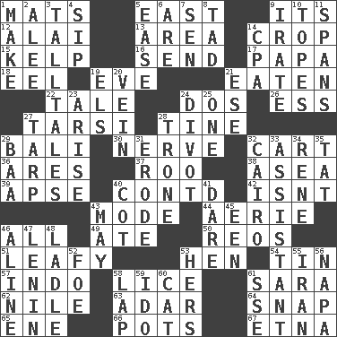 ACROSS 1. Floor coverings 5. Compass direction 9. It is 12. Jai _ 13. Type of rug 14. Riding implement 15. Seaweed 16. Post 17. Dad 18. Snakelike fish 19. First lady 21. Ingested 22. Lie 24. Two (Sp.) 26. Curvy letter 27. Tarsus (plural) 28. Prong on a fork 29. Indonesian resort city 30. Effrontery 32. Draw slowly or heavily 36. Ancient Greek god of war 37. Friend of Pooh 38. At sea 39. Domed church section 40. Continued (abbr.) 42. Is not 43. Method 44. Nest on high 46. Everything 49. Had dinner 50. Vintage cars 51. Like summer trees 53. Layer 54. Shallow baking pan 57. _ china 58. Louse (plural) 61. "Two Mules for Sister ____" 62. "Death on the ____" 63. The sixth month of the Jewish calendar 64. Fastener 65. Compass dir. 66. Cooking vessels 67. Inactive volcano in Sicily DOWN 1. Create 2. Toward shelter 3. Baron Munchausen's specialties 4. Small drink 5. Relaxation 6. "We ___ not amused" (Victoria) 7. Elected rep. 8. Small boy 9. Feeling or showing extreme anger 10. Drinks excessively 11. Connects, as a bridge 14. Accounting whiz (abbr.) 19. Raised railways 20. Distinctive style or manner 21. Compass dir. 23. Get up 24. A piece of turf (Scot.) 25. Single 27. Canvas cover 28. Heavy duty weighing machine 29. Sound made by sheep 31. Eat (away) 32. Capital of Egypt 33. Aide 34. French philosopher Descartes 35. Make lace 40. Small bed 41. Have the gumption 43. Fifth month 45. Car or cant ending 46. Place in a line 47. Soviet premier 1918-24 48. Dipping utensil 52. Enemy 53. Possessive pronoun 55. SW Asia republic 56. California wine valley 58. Infant locale 59. Wedding promise 60. Domesticated feline 61. Compass dir.