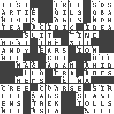 ACROSS 1. Trial 5. Relationship diagram 9. Distress signal 12. Nick name for Arthur 14. Petroleums 15. Chief or king in Benin or Nigeria 16. Disturbances 17. Eras 18. Not either 19. Afternoon social gathering 20. Being or containing an acid 23. It may be bright or harebrained 24. Set of matching outer garments 25. Prong on a fork 27. Water vessel 30. Definite Article 32. Be seated 33. "60 Minutes" Commentator Rooney 34. Hearing organs 36. Electrically charged atom 38. To sift 39. Small bed 40. Shoshoni 43. Tired old horse 46. First man 48. Among 49. Nilotic language 51. Epoch 52. Lettered men learn these first 53. Is hesitant and indecisive 54. Inactive volcano in Sicily 56. Algonquian 58. Rough 61. Title for a knight 64. Luau accessory 65. Droops 66. Gospel singer Marvin 68. Followers of ems 69. Long journey 70. For Whom the Bell _____ 71. Was introduced to 72. At sea 73. Proofreading order DOWN 1. Small pie 2. 4th largest of the Great Lakes 3. Portico 4. Teat (slang) 5. Frog relative 6. Swiss mountan, "Queen of the Mountains" 7. Opts 8. Double-curved letter 9. Message 10. Mitch Miller's instrument 11. "Two Mules for Sister ____" 13. He sold his birthright 21. Quote 22. New York city 23. To the inside or interior of 24. Filthy place 26. One more than two 27. Oblong piece of solid material 28. Single 29. Arabian gulf 31. Eat (away) 35. A viewer who gazes fixedly 37. Unfeeling 41. Nervous spasm 42. Begley and Asner 44. Toward shelter 45. Chewing product 47. Floor coverings 48. Auto club (abbr.) 50. Motion picture awards 53. Robbery 55. A home for chicks 56. Clement's nick name 57. French philosopher Descartes 59. Double curve, resembling the letter S 60. "____ silly question..." 61. Table seasoning 62. Small island 63. Relief 65. R.R. building 67. Greek goddess of the dawn