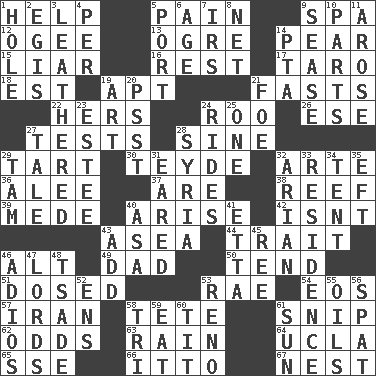 ACROSS 1. Aid 5. Ache 9. Health resort 12. Double curve, resembling the letter S 13. Legendary monster 14. Lightbulb-shaped fruit 15. One who doesn't tell the truth 16. State of inaction 17. Pacific island yam 18. Eastern Standard Time (abbr.) 19. Fitting 21. Goes without food and/or water 22. Possessive pronoun 24. Friend of Pooh 26. Compass dir. 27. Trials 28. Trig term 29. Small pie 30. Miss Universe 1986, Barbara Palacios _ 32. Johnson of "Laugh-In" 36. Toward shelter 37. "We ___ not amused" (Victoria) 38. Coral ridge 39. Ancient Persian 40. Ascend 42. Is not 43. At sea 44. Distinguishing feature 46. Keyboard modifier key 49. Male parent 50. Be inclined (to) 51. Administered medicine 53. Actress Charlotte 54. Greek goddess of the dawn 57. SW Asia republic 58. Wig 61. Sever or remove by pinching or nipping 62. Likelihood 63. Precipitation 64. Southern CA. univ. 65. Compass dir. 66. "Tell ____ the Marines!" 67. A home for chicks DOWN 1. Hollow 2. Armor plate that protects the chest 3. Resembling or made to resemble leather 4. For each 5. Left side of a ship or aircraft 6. Personal question 7. Big collection agency 8. Fish or hair follower 9. Gospel singer Marvin 10. Pieces 11. Came up 14. Parent Teacher Assoc. 19. Nonscientific branch of learning 20. Inconspicuous attention getter 21. Enemy 23. First name in cosmetics 24. Amusement-park features 25. Single 27. Story 28. Damascus' land 29. Scottish cap 31. Having ears or earlike features 32. Believer in; advocate of (suffix) 33. Home 34. Portable shelter 35. Newt 40. White ___ sheet 41. Singer James 43. Find the sum of 45. Portuguese money of account (variant) 46. Goodbye (Sp.) 47. Nobles 48. Sadhe (variant) 52. Followers of ems 53. Former U.S. Attorney General Janet 55. Petroleums 56. Petty quarrel 58. Three (prefix) 59. Consume 60. Teat (slang) 61. Player for Phoenix