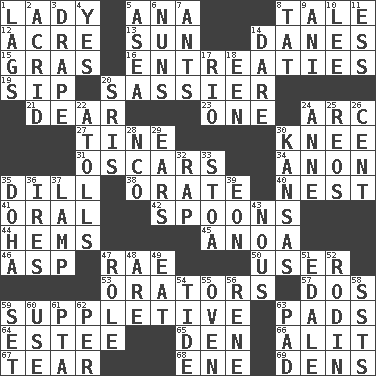 ACROSS 1. Kenny Rogers chart-topper in '80 5. Santa ___, CA 8. Lie 12. 1/640 square mile 13. Player for Phoenix 14. Natives or inhabitants of Denmark 15. Pate de foie ____ 16. Pleas 19. Small drink 20. More lively and spirited 21. Letter starter 23. Single 24. Curve 27. Prong on a fork 30. Leg joint 31. Motion picture awards 34. At once, immediately (arch.) 35. Deli pickle 38. Speak pompously 40. A home for chicks 41. Taken by mouth 42. Soup utensils 44. Cloth borders 45. Small Philippine buffalo 46. Cleo's killer 47. Actress Charlotte 50. One who uses or employs something 53. Speakers 57. Two (Sp.) 59. Supplementary 63. Groovy apts. 64. First name in cosmetics 65. Lair 66. Came down and settled, as after flight 67. Separate forcefully 68. Compass dir. 69. Habitations of wild animals DOWN 1. Straggles 2. Sour-tasting 3. Window treatment 4. Affirmative reply 5. At sea 6. Religious women 7. Pismires 8. Make lace 9. Cuckoo 10. Area sheltered from the wind 11. Double-curved letter 14. Have the gumption 17. River (Sp.) 18. Car or cant ending 20. Indian titles of respect 22. Ringlike coral islands and reefs 24. Singer Murray 25. Vintage cars 26. Penny 28. Non-commissioned officer (abbr.) 29. Hearing organs 30. Sunflower state 32. Reproach for some lapse or misdeed 33. Portico 35. Capital of the state of Qatar 36. Angers 37. Desk light 39. Period of immesurable duration 43. Horse sense 47. Hero or heavy, e.g. 48. "We ___ not amused" (Victoria) 49. Ingest 51. Peak District village in England 52. "The Thinker" sculptor 54. Event that recurs at intervals 55. Baking chamber 56. French philosopher Descartes 58. Fast planes 59. Arrange properly for use 60. Purpose 61. Parent Teacher Assoc. 62. For each 63. Writing tablet