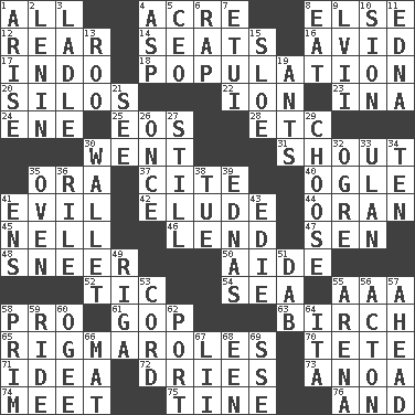 ACROSS 1. Everything 4. Land measure 8. Otherwise 12. Stern 14. Theater features 16. Enthusiastic 17. _ china 18. Census information 20. Grain storage towers 22. Electrically charged atom 23. _ tizzy (2 wds.) 24. Compass dir. 25. Greek goddess of the dawn 28. And so on (abbr.) 30. Gone 31. Yell 35. Mouth or opening 37. Quote 40. Stare 41. Tending to cause great harm 42. Evade 44. NW Algerian seaport 45. 1994 drama film starring Jodie Foster 46. Grant temporary use of 47. Elected rep. 48. Contemptuous expression 50. Assistant 52. Nervous spasm 54. Ocean 55. Auto club (abbr.) 58. Adept person 61. Grand Old Party 63. A tree used for making furniture 65. Complicated, petty procedures 70. False hair 71. The main thing one is thinking about 72. Frees from moisture 73. Small Philippine buffalo 74. Confront 75. Prong on a fork 76. Added to DOWN 1. Originate 2. Soviet premier 1918-24 3. Dipping utensil 4. Cleo's killer 5. Corporate head (abbr.) 6. Hit sharply and swiftly 7. Needle case 8. Consume 9. 57 in ancient Rome 10. The Jewish people; Israel 11. Pulitzer Prize-winning author Ferber 13. Friend of Pooh 15. A type of plum 19. Pismires 21. Observe 26. Single time 27. Not moving 29. Elect 30. Place for singles 32. Legendary monster 33. ____ Bator, Mongolia 34. Nine, plus one 35. Baking chamber 36. Cause heat under the collar 38. Third day of the wk. 39. Ferber et al. 41. Followers of ems 43. Singer Brickell 49. Port city in Latvia 51. Pat or tap gently 53. Drawstring 55. Sports stadium 56. Gambison 57. At or in the front 58. Demure 59. Travel on an animal 60. Double curve, resembling the letter S 62. Left side of a ship or aircraft 64. Call ___ day 66. Floor protector 67. Cards in a Roman deck? 68. Car or cant ending 69. Compass dir.
