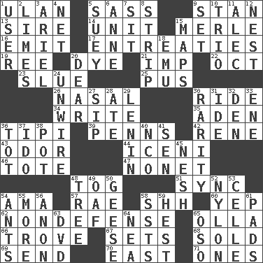 ACROSS 1. ____ Bator 5. Backtalk 9. Comedian Laurel of Laurel & Hardy 13. Title for a man of rank and authority 14. A single undivided whole 15. Haggard of country music 16. Send forth 17. Pleas 19. Portuguese money of account (variant) 20. Color 21. Naughty child 22. Sep. follower 23. Turn sharply 25. Product of festering 26. Rhinal 30. Travel on an animal 34. Compose 35. Arabian gulf 36. Native american tent (variation) 39. Actor Sean's family 42. French philosopher Descartes 43. Scent 44. Ancient Celtic tribe of eastern Britain 46. Lug 47. Music written for nine 48. Coat; cloak 51. Synchronize (abbr.) 54. Nursemaid (var.) 57. Actress Charlotte 58. Quiet! 60. Slangy assent 62. Unrelated to defense, as in spending 65. Water jar 66. Collection of objects 67. Arranges properly for use 68. Exchanged or delivered for money 69. Post 70. Compass direction 71. Singles DOWN 1. One who uses or employs something 2. Citrus fruits 3. Satellite of Uranus 4. Fish or hair follower 5. Chop _ 6. Singer Murray 7. Be seated 8. Empty completely 9. Put into a specified state 10. Musical group of three 11. Actor Baldwin 12. Egg locale 15. Atlas contents 18. Australian flightless bird 20. Letter starter 24. Undo the wiring of 27. Small drink 28. Had dinner 29. Soviet premier 1918-24 30. Noteworthy scarcity 31. Binary compound 32. Lair 33. Compass dir. 36. Small child 37. Wedding promise 38. Cooking vessel 40. Non-commissioned officer (abbr.) 41. Elected rep. 45. Delicate 48. Relationship diagram 49. Clumsy lout 50. Honkers 52. High-strength synthetic material 53. Cell (Danish) 54. Pismires 55. Greater amount 56. Soon (poet.) 58. Fast planes 59. Command 61. Writing tablets 63. Movie disc 64. Teachers' org. 65. Bear (Spanish)