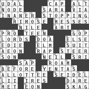 ACROSS 1. Freehold land 5. Head covering 8. Keyboard modifier key 11. Connecting point 12. "Two Mules for Sister ____" 13. By way of 14. More empty; more void 17. Constricting 19. Full of chinks, cracks, or crevices 21. Makes clutter 22. The longest river in the world 23. Tate display 24. Adept person 27. Adolescent 29. Republican Party 32. Nobles 34. ___ good deed 36. Otherwise 37. Singer Brickell 38. Shade tree 39. Costume for a special activity 40. A really long time 41. Strike 42. Guide 43. Manchild 44. Famous astronaut Armstrong 46. _ Lanka 47. Plant excrement 50. Wander 52. Prior to 55. Gossips 57. One to whom something is allotted 59. Beer mug 62. Cards in a Roman deck? 63. Angers 64. Have the gumption 65. Was introduced to 66. Period of immesurable duration 67. Heroin DOWN 1. Corn or form start 2. Spanish title 3. The sixth month of the Jewish calendar 4. Soviet premier 1918-24 5. Domesticated feline 6. Scent 7. Some stationery 8. Advice 9. Actor's bit 10. Labels 12. Compass dir. 15. Gives off 16. Hero or heavy, e.g. 18. Pacific Standard Time (abbr.) 20. Sowing specialist 24. Entreaties 25. Cowboy competition 26. Constellation of myth 28. Pitcher Ryan 29. Cements 30. Flexible twig of a willow tree 31. _ dish (used to culture cells) 33. Lair 35. Electrical Unit 36. Eastern Standard Time (abbr.) 42. Chalkboard 45. Charged particles 47. "Barney Miller" actor Jack 48. Nick name for Arthur 49. Stone: prefix 51. Unmarried girls 52. Lip ointment 53. Writer Wiesel 54. Sudden quick movement 55. It is so 56. Neighbor of Neb. 58. Car or cant ending 60. Epoch 61. Part of a journey