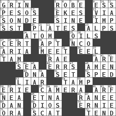 ACROSS 1. Smile widely 5. Loose flowing garment 9. Double-curved letter 12. Mexican monetary units 14. Makes supply last 15. By way of 16. Message 17. Trig term 18. Mischievous child 19. Fast jet (abbr.) 20. Food holders 23. High mountains 24. Tiny particle 25. Petroleums 27. Certainty 30. Fitting 32. Non-commissioned officer (abbr.) 33. Roberta Peters solo 34. Rendezvous 36. Snakelike fish 38. Scottish cap 39. Actress Charlotte 40. "We ___ not amused" (Victoria) 43. Ocean 46. Blunders 48. So be it 49. Heredity factor (abbr.) 51. Arrange properly for use 52. Drove too fast 53. One who doesn't tell the truth 54. Pack (down) 56. 4th largest of the Great Lakes 58. Device for capturing images 61. Sandy's bark 64. Teachers' org. 65. Inactive volcano in Sicily 66. Indian princess (variant) 68. One of the 12 tribes of Israel 69. "Vaya con ____" 70. Bert's buddy 71. Mouth or opening 72. Jazz singing style 73. Look after DOWN 1. Global Positioning Systems (abbr.) 2. Vintage cars 3. Is not 4. Lower and raise head in agreement 5. Repose 6. Migrant worker of the '30s 7. Gillaume's butler role 8. Compass dir. 9. Vices 10. Simple or foolish person 11. Plant excrements 13. Back-to-school mo. 21. Rich soil 22. Electrical Unit 23. Medicinal plant 24. _ moment's notice (2 wds.) 26. Frozen water 27. Domesticated feline 28. Epoch 29. Basketball hoops 31. Pulls apart 35. Cylindrical with tapered ends 37. Desk light 41. To separate or throw off 42. Conclusion 44. Singer Brickell 45. Santa ___, CA 47. Play the lead 48. Viper 50. Northern region 53. Climbing, woody, usually tropical vines 55. Female horse 56. Inside; within (prefix) 57. Located in or toward the back 59. Small Philippine buffalo 60. Vertical spar for supporting sails 61. Singer Murray 62. It's straight from the horse's mouth 63. Nourish 65. Begley and Asner 67. Tate display