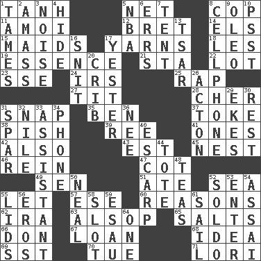 ACROSS 1. Hyperbolic tangent 5. Remaining after all deductions 8. Police officer (slang) 11. Mine, in Marseilles 12. Cy Young winner Saberhagen 14. Raised railways 15. Women servants 17. Tall tales 18. French article 19. Gist 21. R.R. building 22. Car dealer's back yard 23. Compass dir. 24. Big collection agency 25. Hit sharply and swiftly 27. Teat (slang) 28. "Mermaids" star 31. Fastener 35. Benjamin's nick name 37. Puff or smoke 38. Expression of disdain 39. To separate or throw off 41. Washington bills 42. In addition 43. Eastern Standard Time (abbr.) 45. Egg locale 46. It's straight from the horse's mouth 47. Small bed 49. Elected rep. 51. Had dinner 52. Ocean 55. Allow 57. Compass dir. 60. Thinks logically 62. Lyricist Gershwin 63. Columnist Joseph or Stewart 65. Table seasonings 66. Spanish title 67. Grant temporary use of 68. The main thing one is thinking about 69. Fast jet (abbr.) 70. Third day of the wk. 71. Australian parrot (variant) DOWN 1. Corrects by punishment or discipline 2. Collect or gather 3. Annoying sound 4. Flintstone garb 5. Basketball assoc. 6. Blunders 7. Portable shelter 8. Portable communications device 9. Margarine 10. Inconspicuous attention getter 13. Russian ruler of old 16. In a ____ (agitated or irritated) 17. Last 20. Baby bed with high sides 26. NE Massachussets city 29. Supplements with great effort 30. Respite 31. Practice fight 32. "Death on the ____" 33. Helper 34. Give a jingle 36. Born 40. Fortification 44. Lug 48. Afternoon social gatherings 50. Anneal 52. Twentieth part of a lira 53. Keyboard key 54. Slender Brazilian palm 55. Hats (slang) 56. Greek god of love 58. Narrow, elongated depression 59. Son of Isaac 61. Move on water 64. Single