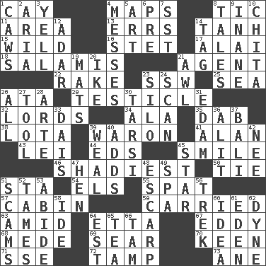 ACROSS 1. Island 4. Atlas contents 8. Nervous spasm 11. Type of rug 13. Blunders 14. Hyperbolic tangent 15. Uncontrolled 16. Proofreading order 17. Jai ____ 18. Deli grouping 21. Representative 22. Immoral or dissolute person 23. Compass dir. 25. Ocean 26. "One Day ___ Time" 29. One of the two male reproductive glands 32. Nobles 34. Wing 35. Small moist lump or mass 38. Globular water bottle used in Asia 39. Make _____ (do battle with) 41. ____ Jay Lerner 43. Luau accessory 44. Begley and Asner 45. Grin 46. Most questionable 50. Make a knot 51. R.R. building 54. Raised railways 55. Petty quarrel 57. Apartment or room in a ship 59. Borne 63. Among 64. Singer James 67. Whirlpool 68. Ancient Persian 69. Burn superficially 70. Peachy ____! 71. Compass dir. 72. Pack (down) 73. A saturated hydrocarbon DOWN 1. Crow sounds 2. Operatic vocal solo 3. Shout 4. Makes clutter 5. Nonscientific branch of learning 6. Before (prefix) 7. Fast jet (abbr.) 8. Stories 9. Lacking in sense or substance 10. Riviera of "Kiss of the Spider Woman" 12. The sixth month of the Jewish calendar 14. Label 19. Floor coverings 20. D.D.E's nickname 21. Leather borer 23. Grain storage tower 24. Glance over 26. 100% 27. Instrument 28. Johnson of "Laugh-In" 30. Tarsus (plural) 31. Dutch treat 33. Raised platform 36. Set down 37. Indonesian resort city 39. Welt 40. Does sums 42. Born 45. Play the lead 47. Layer 48. Fortification 49. Health resort 51. Fraudulent business schemes 52. Corrects by punishment or discipline 53. Tolerate 56. Long journey 58. Binary compound 60. It may be bright or harebrained 61. Locale of original sin 62. Centimeter-gram-second unit of force 64. Eastern Standard Time (abbr.) 65. Beverage made from leaves 66. Scottish cap