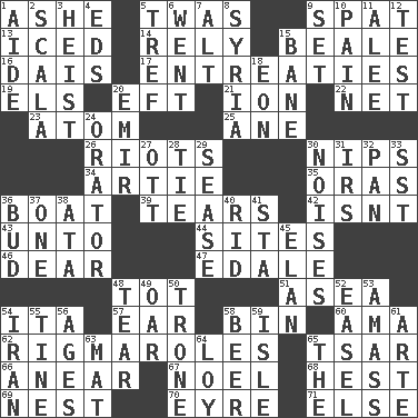 ACROSS 1. American tennis player Robert 5. It was, poetically 9. Argument over a trivial matter 13. On the rocks 14. Depend 15. Calif. Air Force Base 16. Raised platform 17. Pleas 19. Raised railways 20. Newt 21. Electrically charged atom 22. Fish or hair follower 23. Smallest unit of an element 25. One (Scot) 26. Disturbances 30. Cuts off 34. Nick name for Arthur 35. Mouths or openings 36. Water vessel 39. Lacerates 42. Is not 43. To (old English) 44. Settings 46. Letter starter 47. Peak District village in England 48. Small child 51. Toward the sea 54. Call ___ day 57. Ewer handle 58. Storage container 60. Housemaid (var.) 62. Frustrating wastes of time 65. Russian ruler of old 66. Approach 67. Christmas carol 68. Command 69. Egg locale 70. Jane of fiction 71. Otherwise DOWN 1. Assistant 2. Any of the three canals of the cochlea 3. Robbery 4. Begley and Asner 5. Not kosher 6. Gone 7. The first octave above the treble staff 8. Damascus' land 9. Put into a specified state 10. Ache 11. Toward shelter 12. Trial 15. Object of repulsion 18. Period of immesurable duration 20. Arab leader 24. Speaker 27. Baseball player Mel 28. Neckwear 29. Gospel singer Marvin 30. Annoying sounds 31. Big collection agency 32. Baking dish 33. Fast jet (abbr.) 36. Partially opened flower 37. Single 38. "One Day ___ Time" 40. To free from 41. R.R. building 45. Enthusiasm 48. Pull apart 49. Rowing implement 50. Marketplace scale 52. Artist's stand 53. Collect or gather 54. SW Asia republic 55. Prong on a fork 56. Grows older 58. Fermented drink made from hops 59. Capri or Wight 61. Johnson of "Laugh-In" 63. Floor protector 64. Myrna of the movies 65. Definite Article