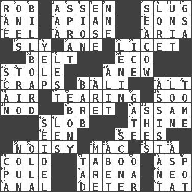 ACROSS 1. Director Reiner 4. NE Netherlands city 9. Strike heavily 13. Black tropical American cuckoo 14. Bee-related 15. Immeasurably long periods of time 16. Snakelike fish 17. Came up 18. Roberta Peters solo 19. Insidious 21. A saturated hydrocarbon 22. It is permitted: Lat. 24. Waist strap 26. Environmental prefix 27. Fur scarf 29. Afresh 30. Dice game 31. Indonesian resort city 33. The first octave above the treble staff 36. Atmosphere 37. Separating forcefully 40. "Barney Miller" actor Jack 41. Allow head to fall sleepily 42. Cy Young winner Saberhagen 43. Indian state 45. Messy guy 47. One or ones belonging to thee 48. Car or cant ending 49. Observes 50. Annoyingly loud 52. Apple computer (short form) 54. R.R. building 56. Having a low temperature 57. Off limits 59. Viper 61. Whine 62. Sports stadium 63. Modern: prefix 64. Of or related to the anus 65. Prevent from occurring 66. Make lace DOWN 1. Actress Charlotte 2. Singles 3. Big road sign 4. Auto club (abbr.) 5. Small fatty European fish 6. The Jewish people; Israel 7. Relaxation 8. Compass dir. 9. Manatee 10. Old wives' tales, e.g. 11. A single undivided whole 12. Girls' org. (abbr.) 20. Sharp bark 22. Soviet premier 1918-24 23. Frozen water 25. For fear that 27. Examine hastily 28. Musical group of three 29. Came down and settled, as after flight 31. Sharp remark 32. "We ___ not amused" (Victoria) 33. Aide 34. Grant temporary use of 35. Heavy book 38. Dark wood 39. Yard entry 44. "______ My Girl" (Turtles hit) 45. Beer mug 46. French article 49. Biscuitlike quick bread 50. Part of speech 51. Spanish pot 52. Female horse 53. Collude with 55. Toward the sea 56. Tax preparer (abbr.) 57. Small boy 58. Boat paddle 60. Plant holder