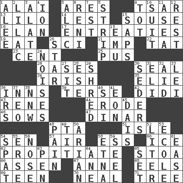ACROSS 1. Jai _ 5. Ancient Greek god of war 9. Russian ruler of old 13. _ and Stitch 14. For fear that 15. Lush 16. Style 17. Pleas 19. Consume 20. _-fi 21. Mischievous child 22. Make lace 23. Penny 25. Product of festering 26. Fertile tracts in a desert 30. Lick closed 34. From or relating to Ireland 35. Writer Wiesel 36. Lodging establishments 39. Laconic 42. "You Light Up My Life" star Conn 43. French philosopher Descartes 44. Eat (away) 46. Sty mamas 47. Middle Eastern gold or silver currency 48. Parent Teacher Assoc. 51. Capri or Wight 54. Elected rep. 57. Wind 58. Curvy letter 60. Frozen water 62. Conciliate 65. Portico 66. NE Netherlands city 67. Singer Murray 68. Snakelike fish 69. Adolescent 70. Actress Patricia 71. Relationship diagram DOWN 1. Toward shelter 2. Pale purple color 3. Having winglike extensions 4. Electrically charged atom 5. Actor Baldwin 6. Painter Guido (1575-1642) 7. Eastern Standard Time (abbr.) 8. Remove all contents or possession from 9. Small child 10. Set or collection 11. At sea 12. Take ten 15. Plant excrements 18. Australian flightless bird 20. Play the lead 24. Annoying sounds 27. Be seated 28. Compass dir. 29. Tear up 30. Spring feasts 31. Connecticut Ivy Leaguer 32. Help 33. Flowery wreath 36. Big collection agency 37. Modern: prefix 38. Compass dir. 40. Indian title of respect (Mr.) 41. Period of immesurable duration 45. Raised platform 48. Ache 49. Teat (slang) 50. Believer in; advocate of (suffix) 52. 61 cubic inches 53. Learning spot: Fr. 54. Argument over a trivial matter 55. Celtic language 56. Characteristic smell of wine 58. Inactive volcano in Sicily 59. Sew up the eyelids of hawks and falcons 61. Relaxation 63. Fenced enclosure 64. One (Scot) 65. Arrange properly for use