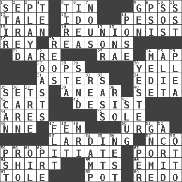 ACROSS 1. Back-to-school mo. 5. Shallow baking pan 8. Global Positioning Systems (abbr.) 12. Story 13. Wedding promise 14. Mexican monetary units 15. SW Asia republic 16. One who advocates reunion 19. Marina Del _, California 20. Thinks logically 21. Have the gumption 23. Actress Charlotte 24. Atlas unit 27. I made a mistake 30. Shout 31. Michaelmas daisies 34. Singer Brickell 35. Arranges properly for use 38. Approach 40. Stalk of a moss capsule 41. Haul 42. Cease 44. Ancient Greek god of war 45. Not divided or shared with others 46. Compass dir. 47. Opposite of masc. 50. Capital and largest city of Mongolia 53. Preparing or cooking with lard 57. Non-commissioned officer (abbr.) 59. Conciliate 63. Left side of a ship or aircraft 64. Upper-body garment 65. Mountains (abbr.) 66. Send forth 67. Lacquered or enameled metalware 68. Cooking vessel 69. Do over again DOWN 1. Commotion 2. Having ears or earlike features 3. Beach, in Buenos Aires 4. "___ Little Indians" 5. Hoop that covers a wheel 6. The main thing one is thinking about 7. Good sense 8. Commissioned military rank (abbr.) 9. Air pressure measure (abbr.) 10. Distress signal 11. Fast jet (abbr.) 14. Introduce or present, as a question 17. And not 18. _ tizzy (2 wds.) 20. Vintage cars 22. Exposes to great heat 24. Ancient Persian 25. Set down 26. Entreaty 28. Parent Teacher Assoc. 29. Post 30. Next before 32. To separate or throw off 33. Backtalk 35. Examine hastily 36. Merit 37. Relationship diagram 39. _ de Janeiro 43. Strike heavily 47. Secret move to avoid paying debts 48. Ingest 49. Medical imaging device (abbr.) 51. Dwarf 52. Bitter 54. Moist 55. "Tell ____ the Marines!" 56. A home for chicks 58. "Beetle Bailey" pooch 59. Pacific Standard Time (abbr.) 60. 17th letter of the Greek alphabet 61. Lubricate 62. Before (prefix) 63. For each