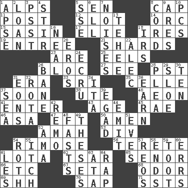 ACROSS 1. High mountains 5. Elected rep. 8. Head covering 11. Mail 12. Notch 14. The grampus (Milton) 15. Indian antelope 17. Writer Wiesel 18. Angers 19. Main course 21. Broken pieces 23. "We ___ not amused" (Victoria) 25. Snakelike fish 26. Coalition 27. Perceive with the eye 28. Pacific Standard Time (abbr.) 31. Epoch 33. Indian title of respect (Mr.) 35. Cell (Danish) 37. Within a short period 38. Shoshoni 40. A really long time 41. Keyboard key 43. Personal question 45. Actress Charlotte 46. White ___ sheet 47. Newt 50. So be it 52. Housemaid 53. HTML Container Element 54. Full of chinks, cracks, or crevices 56. Cylindrical with tapered ends 61. Globular water bottle used in Asia 62. Russian ruler of old 65. Sir (Sp.) 66. And so on (abbr.) 67. Bristle 68. Scent 69. Quiet! 70. Plant excrement 71. Fast planes DOWN 1. Domed church section 2. Grant temporary use of 3. Inconspicuous attention getter 4. Disorderly outburst 5. Compass dir. 6. Pipe bend 7. Annoying sounds 8. Drawstring 9. Ancient Greek god of war 10. Personal Computers (abbr.) 13. Giggle 16. Actress Patricia 18. Big collection agency 20. Greek god of love 22. Actor Baldwin 24. Shade of tan 26. Object of repulsion 28. Entreaty 29. _ gin 30. Nine, plus one 31. Immeasurably long periods of time 32. Roll call or roster of names 34. Call ___ day 36. Merit 37. Ocean 39. Mild oath 42. San ____ (Riviera town) 44. Send forth 48. Goes without food and/or water 49. College papers 51. Nights before holidays 52. Nanny (var.) 54. Writer of Portnoy's Complaint (1969) 55. Hankering 57. Vintage cars 58. Conclusions 59. A blast of a horn 60. Blunders 61. French article 63. _ moment's notice (2 wds.) 64. Hit sharply and swiftly
