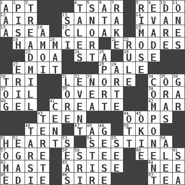 ACROSS 1. Fitting 4. Russian ruler of old 8. Redecorate 12. Atmosphere 13. Before Barbara or Clara 14. "Terrible" tsar 15. At sea 17. Covering 18. Female horse 19. More given to overacting 21. Eats (away) 23. ___ good deed 24. R.R. building 26. Purpose 27. Give off 28. Diluted with white 30. Three (prefix) 31. Poe poem 34. Gear tooth 37. Lubricate 38. Unconcealed 39. Mouth or opening 40. Set 41. Cause to be 42. Spoil 43. Adolescent 44. I made a mistake 46. "___ Little Indians" 47. Label 50. Ring climax 51. Centers of feelings and intuitions 54. French poetic form 57. Legendary monster 58. First name in cosmetics 60. Snakelike fish 62. Vertical spar for supporting sails 63. Originate 64. Born 65. Singer Brickell 66. Beget 67. Afternoon social gathering DOWN 1. American Automobile Association (abbr.) 2. Expression of disdain 3. Excercise machine 4. Falsehoods 5. Derisive sound 6. _ moment's notice (2 wds.) 7. Immoral or dissolute person 8. Full of chinks, cracks, or crevices 9. Elude 10. Have the gumption 11. Singles 13. _-fi 16. Mine, in Marseilles 20. Floor protector 22. Governing power 25. To the left, to Queeg 27. 4th largest of the Great Lakes 29. Johnson of "Laugh-In" 30. Coat; cloak 31. Old wives' tales, e.g. 32. Incident 33. Teachers' org. 34. Part 35. Mouths or openings 36. Slender fish 41. Penny 43. Cigar-shaped 44. Baseball player Mel 45. Migrant worker of the '30s 46. Tarsus (plural) 48. Being in motion 49. Honkers 51. Residence 52. Mild oath 53. Oceans 55. Observe 56. Toward shelter 59. Indian title of respect (Mr.) 61. Ocean