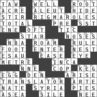 ACROSS 1. The 23rd letter of the Hebrew alphabet 4. Not ill 8. Carrot, for example 12. Measure of real estate 14. Native American of Southwest Alaska 16. Flintstone garb 17. Use a spoon 18. Frustrating wastes of time 20. Add up to 22. Before (prefix) 23. Fast jet (abbr.) 24. Compass dir. 25. Often (poetically) 28. Nervous spasm 30. Play the lead 31. Olfactory organs 35. Basketball assoc. 37. Wander aimlessly 40. General guideline 41. One third of a yard 42. Keyboard key 44. Egg locale 45. He sold his birthright 46. Comfort 47. Sight organ 48. Distance measurement (Brit.) 50. South American Indian 52. Compass dir. 54. Police officer (slang) 55. Cask 58. Oval reproductive body of a fowl 61. Lair 63. Get up 65. Interpreter 70. Johnson of "Laugh-In" 71. Nathan's nickname 72. Damascus' land 73. Sliced desserts 74. At sea 75. Drop; flow; fall 76. Born DOWN 1. Clothes sense 2. 13-14th century defensive garment 3. Compose 4. Armed conflict 5. Biblical high priest 6. Part of a journey 7. Mass 8. 17th letter of the Greek alphabet 9. Lubricates 10. Lyric poems 11. Trial 13. Epoch 15. Small pie 19. It's straight from the horse's mouth 21. Car dealer's back yard 26. Conductor's collection 27. Marketplace scale 29. Pupil covering 30. Titan orbits this 32. Chop _ 33. Otherwise 34. Arrange properly for use 35. Olfactory organ 36. Water vessel 38. "One Day ___ Time" 39. Of or pertaining to a meson 41. Opposite of masc. 43. Western Nevada city 49. Conclusions 51. Accounting whiz (abbr.) 53. Snakelike fish 55. Japanese brewing company 56. First name in cosmetics 57. Honkers 58. Inactive volcano in Sicily 59. Pate de foie ____ 60. Yard entry 62. Negative votes 64. Strike 66. Teachers' org. 67. Three (prefix) 68. Petroleum 69. Actress Charlotte