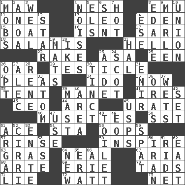 ACROSS 1. Opening into something insatiable 4. Tender 8. Australian flightless bird 11. Washington bills 13. Margarine 14. Paradise 15. Water vessel 16. Is not 17. Indian skirt 18. Deli grouping 21. Phone greeting 22. Libertine 23. White ___ sheet 25. Car or cant ending 26. Boat paddle 29. A testis 32. Entreaties 34. Wedding promise 35. Cut the grass 38. Portable shelter 39. French painter Edouard 41. Angers 43. Corporate head (abbr.) 44. Curve 45. A salt of uric acid 46. French bagpipes 50. Fast jet (abbr.) 51. Adept person 54. R.R. building 55. I made a mistake 57. Remove soap 59. Motivate 63. Pate de foie ____ 64. Actress Patricia 67. Operatic vocal solo 68. Johnson of "Laugh-In" 69. 4th largest of the Great Lakes 70. Bits 71. Whopper 72. Electrical Unit 73. Remaining after all deductions DOWN 1. Crowds into 2. Small Philippine buffalo 3. Welt 4. Annoying sounds 5. Raised railways 6. Elected rep. 7. Being at a high temperature 8. Peak District village in England 9. Haggard of country music 10. The state of being joined or united 12. Play the lead 14. Compass dir. 19. Floor protectors 20. Mamie's mate 21. Actor Linden 23. Helper 24. Highlander 26. Elect 27. Actor Baldwin 28. French philosopher Descartes 30. A color or tint 31. Arab leader 33. Tiny particle 36. Mouths or openings 37. Soaks 39. Vertical spar for supporting sails 40. Type of rug 42. Put into a specified state 45. United States Postal Service (abbr.) 47. Purpose 48. Bathroom plumbing fixture 49. A really long time 51. Therefore, facetiously 52. High-altitude cloud 53. Maternal 56. Argument over a trivial matter 58. Compass dir. 60. SW Asia republic 61. Travel on or in a vehicle 62. Compass direction 64. ___ Haven, CT 65. Epoch 66. Small island
