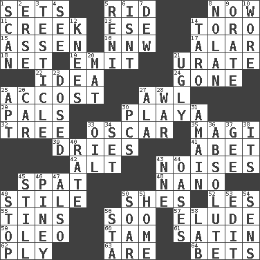 ACROSS 1. Arranges properly for use 5. To free from 8. At this time 11. Small stream 13. Compass dir. 14. "Corrida" creature 15. NE Netherlands city 16. Compass dir. 17. Having or resembling wings 18. Fish or hair follower 19. Give off 21. A salt of uric acid 22. The content of cognition 24. Went 25. Buttonhole 27. Leather borer 29. Friends 30. Beach, in Buenos Aires 32. Woody plant 33. Witty Wilde 35. Wise men 39. Frees from moisture 41. Collude with 42. Keyboard modifier key 43. Annoying sounds 45. Petty quarrel 48. Billionth: prefix 49. Vertical member of a panel or frame 50. "______ My Girl" (Turtles hit) 52. French article 55. Metal containers 56. "Barney Miller" actor Jack 57. Evade 59. Butter sub 60. Scottish cap 61. Smooth fabric 62. Apply oneself diligently 63. "We ___ not amused" (Victoria) 64. Stakes DOWN 1. Glance over 2. Celtic language 3. A testis 4. Perceive with the eye 5. Painter Guido (1575-1642) 6. Is not 7. Morning condensation 8. Pitcher Ryan 9. Declaim 10. Had on 12. Leg joints 14. Pacific island yam 20. Floor covering 21. Repulsive 23. Administered medicine 25. Fitting 26. Auto 27. In the manner of 28. Armed conflict 30. Personal Computers (abbr.) 31. With great haste 33. Lubricate 34. Arrange properly for use 36. Utter; complete 37. Unit of force equal to gravity 38. It is 40. Pace 43. Compass dir. 44. Fertile tracts in a desert 45. Not moving 46. Abounding in pines 47. In addition 49. Obstruct or block passage 50. Fly high 51. Dwelling 53. Prepare for publication 54. Elected reps. 56. R.R. building 58. Experiment locale