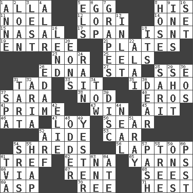 ACROSS 1. Silent film actress Nazimova 5. Ovum 8. Part of HMS, perhaps 11. Christmas carol 12. Australian parrot (variant) 14. Single 15. Relating to the nose 17. Connect, as a bridge 18. Is not 19. Main course 21. Food holders 23. Not either 25. Snakelike fish 26. Pulitzer Prize-winning author Ferber 27. R.R. building 28. Compass dir. 31. Bit 33. Be seated 35. Potato state 37. "Two Mules for Sister ____" 38. Dreamland 40. Greek god of love 41. First class 43. Victory 45. Small island 46. "One Day ___ Time" 47. Myrna of the movies 50. Wither 52. Assistant 53. Auto 54. Tears up 56. Portable computer 61. Not kosher 62. Inactive volcano in Sicily 65. Entertaining tales 66. By way of 67. Monthly bill 68. Observes 69. Viper 70. To riddle 71. Behest DOWN 1. Queen of England 1702-14 2. Grant temporary use of 3. For fear that 4. Having or resembling wings 5. Raised railways 6. Grand Old Party 7. Wine fruits 8. Flexible conduit 9. Taverns 10. Put into a specified state 13. An arm off of a larger body of water 16. Grant temporary use of 18. ___ a Wonderful Life 20. Immeasurably long periods of time 22. Jai _ 24. Precipitation 26. Dutch treat 28. Indian skirt 29. Attempt 30. Greek goddess of the dawn 31. Small pie 32. Operatic vocal solo 34. Pull behind 36. Letter starter 37. Health resort 39. Plate 42. Writer Wiesel 44. Anneal 48. More peculiar 49. Last 51. Like ___ of sunshine 52. Sandy's bark 54. Indian titles of respect 55. Pile 57. Romantic infatuation 58. Woody plant 59. Washington bills 60. Inconspicuous attention getter 61. Federal power corp. 63. Compass dir. 64. Had dinner