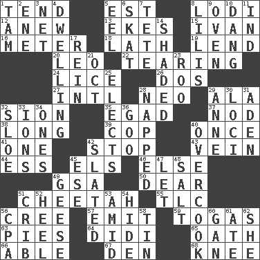 ACROSS 1. Be inclined (to) 5. Eastern Standard Time (abbr.) 8. Farming town in central California 12. Afresh 13. Supplements with great effort 15. "Terrible" tsar 16. Distance measurement 18. Thin strip of wood or metal 19. Grant temporary use of 20. Lion 22. Pulling into pieces 24. Louse (plural) 26. Two (Sp.) 27. International (abbr.) 28. Modern: prefix 29. Insect wing 32. The Jewish people; Israel 35. Mild oath 37. Allow head to fall sleepily 38. Having great length 39. Police officer (slang) 40. At one time in the past 41. Single 42. Cease 43. Distinctive style or manner 44. Curvy letter 45. Raised railways 46. Otherwise 49. Girls' org. (abbr.) 50. Letter starter 51. Leopard's kin 55. Affectionate concern, for short 56. Algonquian 57. Give off 59. Ancient Roman robes 63. Sliced desserts 64. "You Light Up My Life" star Conn 65. Pledge 66. Competent 67. Lair 68. Leg joint DOWN 1. Scottish cap 2. Compass dir. 3. Remaining after all deductions 4. Residence 5. Snakelike fish 6. Three-handed card game 7. False hair 8. Ms. Damita and namesakes 9. Baking chamber 10. Mild oath, euphamism for damn 11. Indiana (abbr.) 14. Cast a shadow over 17. It's straight from the horse's mouth 21. Sep. follower 23. Friend of Pooh 25. Opts 28. Slept 29. Queen of England 1702-14 30. Event scenes 31. Arabian gulf 32. _ gin 33. Charged atoms 34. Singles 36. Thick or sticky substance 40. Burn the roast 42. Scheduled 45. Compass dir. 47. Allow 48. Table seasoning 49. Honkers 51. Baby bed with high sides 52. The bottom of a shoe or boot 53. Among 54. Flintstone garb 56. Tax preparer (abbr.) 58. Metal container 60. Separate the seeds from cotton 61. Had dinner 62. A female animal or person