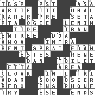 ACROSS 1. Cook's measure (abbr.) 5. Pacific Standard Time (abbr.) 8. White ___ sheet 11. Nick name for Arthur 13. One more than two 14. Mountain range 15. More valued for its uncommonness 16. Before (prefix) 17. Bristle 18. Parent Teacher Association (abbr.) 19. Double curve, resembling the letter S 21. Soviet premier 1918-24 22. Event that recurs at intervals 24. SW Asia republic 25. Main course 27. ___ good deed 29. Small Philippine buffalo 30. Kind of red light 32. Monthly bill 33. Small fatty European fish 35. Dutch treat 39. _____ Park, CO 41. French philosopher Descartes 42. One of the 12 tribes of Israel 43. Bathroom 45. Singer James 48. Type of rug 49. Hide under a false appearance 50. International (abbr.) 52. Three (prefix) 55. The sixth month of the Jewish calendar 56. "Barney Miller" actor Jack 57. Flexible twig of a willow tree 59. Redecorate 60. Followers of ems 61. Give a jingle 62. Attempt 63. Compass dir. 64. Conclusions DOWN 1. Canvas cover 2. Naughty child 3. Ski resort town in Vermont 4. Sliced dessert 5. Corncob 6. Title for a man of rank and authority 7. Neckwear 8. Sports stadium 9. Smooth fabric 10. Actor Alda or Thicke 12. Eat (away) 14. One who makes use of a thing 20. Unit of force equal to gravity 21. One who doesn't tell the truth 23. Feeling or showing extreme anger 25. Hearing organ 26. Compass dir. 27. Heredity factor (abbr.) 28. Often (poetically) 30. Big collection agency 31. Nest on high 33. R.R. building 34. Writing instrument 36. Conveyance 37. One (Scot) 38. Was introduced to 40. Neighbor of Neb. 43. Make lace 44. Lowest deck of a ship 45. A person who is older than you are 46. Sycophant 47. Edible starchy tuberous root 49. Draw slowly or heavily 50. Charged atoms 51. Characteristic smell of wine 53. Tear apart 54. Angers 56. Observe 58. A female animal or person