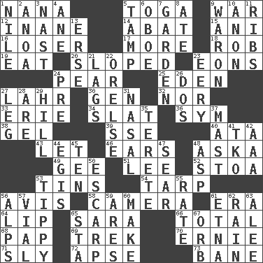 ACROSS 1. Nanny 5. Ancient Roman robe 9. Armed conflict 12. Silly 14. Blind as ____ 15. Black tropical American cuckoo 16. Failure 17. Greater amount 18. Director Reiner 19. Erode 20. Had an oblique or slanted direction 23. Immeasurably long periods of time 24. Lightbulb-shaped fruit 25. Genesis locale 27. Cowardly lion portrayer 30. Commissioned military rank (abbr.) 32. Not either 33. One of the Great Lakes 34. Narrow board 36. Symbol (abbr.) 38. Set 39. Compass dir. 40. _ moment's notice (2 wds.) 43. Allow 46. Hearing organs 48. "____ silly question..." 49. Turn to the right 51. Area sheltered from the wind 52. Portico 53. Airtight sealed metal containers 54. Canvas cover 56. Deliberation 58. Device for capturing images 61. Period 64. Mouth edge 65. "Two Mules for Sister ____" 66. "_____ Recall" 68. Infant food 69. Long journey 70. Bert's buddy 71. Stealthy 72. Domed church section 73. Object of repulsion DOWN 1. The longest river in the world 2. Small Philippine buffalo 3. Political cartoonist Thomas 4. One (Scot) 5. Pack (down) 6. Mitch Miller's instrument 7. Place where plants grow 8. Had dinner 9. Make _____ (do battle with) 10. At once, immediately (arch.) 11. Teases 13. Celtic language 21. Straggles 22. Threatening words 23. Suggestive of the supernatural 24. Before (prefix) 26. Two (Sp.) 27. Part of a journey 28. "We ___ not amused" (Victoria) 29. Land elevation 31. Relating to the nose 35. Cigar-shaped 37. Vertical spar for supporting sails 41. Ring climax 42. Auto club (abbr.) 44. The front part of a cuirass 45. "___ Little Indians" 47. Shrivel 48. Cleo's killer 50. Fortification 53. Likely to tip or tilt 55. Assign a rank or rating to 56. High mountains 57. Small bottle 59. Ancient Greek god of war 60. Create 61. Inactive volcano in Sicily 62. Precipitation 63. Toward shelter 65. R.R. building 67. Globe
