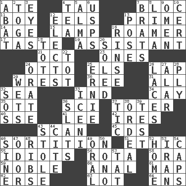 ACROSS 1. Had dinner 4. The 19th letter of the Greek alphabet 7. Group of countries in special alliance 11. Male child 12. Snakelike fish 13. First class 14. Personal question 15. Desk light 16. Nomad 17. Clothes sense 19. Helper 21. Sep. follower 23. Washington bills 24. "Beetle Bailey" pooch 25. Raised railways 26. Infant locale 29. Take or capture by force 30. Portuguese money of account (variant) 31. 100% 32. Ocean 33. Working for oneself (abbr.) 34. Island 35. Baseball player Mel 36. _-fi 37. Carrier 40. Compass dir. 41. Area sheltered from the wind 42. Angers 43. Examine minutely or intensely 45. Music discs 46. Decision 51. Moral principle 55. Foolish or stupid persons 56. Round or rotation of duties 58. Mouth or opening 59. Impressive in appearance 60. Of or related to the anus 61. Atlas unit 62. Celtic language 63. Car dealer's back yard 64. Followers of ems DOWN 1. Blind as ____ 2. Ancient Roman robe 3. Sight organs 4. Afternoon social gathering 5. _ mater 6. United States Postal Service (abbr.) 7. Naughty children 8. Pale green bean 9. Sign of something about to happen 10. Foregone conclusion 12. Opts 13. Introduce or present, as a question 16. Remove soap 18. Haul 20. Having a sole or soles 22. Small child 24. Speak pompously 25. Bert's buddy 26. Shoestrings 27. Having or resembling wings 28. Apply oneself diligently 29. Moistens 32. Mayday 33. Ancient Celtic tribe of eastern Britain 36. Narrow boards 37. Nervous spasm 38. Severe or trying experience 39. Trial 43. Took without asking 44. Quote 46. Trig term 47. Scent 48. Teases 49. Spoken 50. Words to Nanette 52. Dwelling 53. SW Asia republic 54. Balmoral and tarboosh 57. Make lace