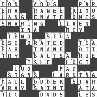 ACROSS 1. A really long time 4. Does sums 8. Infant food 11. Epoch 12. The wife of a rajah (variant) 14. Tall New Zealand timber tree 15. Austrian-born American filmmaker Fritz 17. Maternal 18. Singles 19. Catching in a trap 21. Make or become more lively 23. _ tizzy (2 wds.) 24. Marina Del _, California 25. Be inclined (to) 27. Portico 30. Compass dir. 31. Spoke pompously 34. Beverage made from leaves 37. At a great distance 38. Empty; void 39. Baseball player Mel 40. Attempt to accomplish something 41. Greek mezzo-soprano Agnes 43. Sorrow 44. Capri or Wight 45. Locales 47. Nilotic language 49. Groovy apt. 50. Public displays of written messages 52. Preparing or cooking with lard 56. Shopping center 57. More peculiar 60. Play the lead 61. Like ___ of sunshine 62. Inhabitant of Heaven 63. _ moment's notice (2 wds.) 64. Nervous spasm 65. Movie discs 66. French article DOWN 1. Snakelike fish 2. NW Algerian seaport 3. Nanny 4. Sports stadium 5. Mild oath, euphamism for damn 6. Heredity factor (abbr.) 7. Put into a specified state 8. Abounding in pines 9. So be it 10. Product of festering 13. Snakelike fish 14. Be footloose 16. Smile widely 20. Southeast Asian peninsula 22. Retirement account (abbr.) 25. Russian ruler of old 26. Suggestive of the supernatural 27. Lacking originality or spontaneity 28. Portable shelter 29. Lyric poems 30. Newt 32. Chest bones 33. Of or related to the anus 34. Torque (variant) 35. Needle holder 36. Had dinner 42. Having or resembling wings 44. Electrically charged atom 46. Likelihood 47. Pale purple color 48. Unsightly 49. Actors' quests 50. Indian skirt 51. Mayday 52. Grant temporary use of 53. Slanted text style (abbr.) 54. Nathan's nickname 55. Pate de foie ____ 56. Floor covering 58. June honoree 59. HTML Container Element