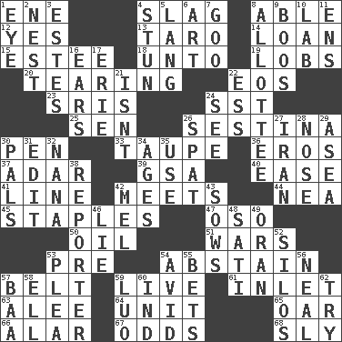 ACROSS 1. Compass dir. 4. Volcanic refuse 8. Competent 12. Affirmative reply 13. Pacific island yam 14. Grant temporary use of 15. First name in cosmetics 18. To (old English) 19. Tennis shots 20. Pulling into pieces 22. Greek goddess of the dawn 23. Indian titles of respect 24. Fast jet (abbr.) 25. Elected rep. 26. French poetic form 30. Fenced enclosure 33. Grayish beige 36. Greek god of love 37. The sixth month of the Jewish calendar 39. Girls' org. (abbr.) 40. Comfort 41. Actor's bit 42. Confronts 44. Teachers' org. 45. Paper fasteners 47. Bear (Spanish) 50. Petroleum 51. Armed conflicts 53. Before (prefix) 54. Choose not to consume 57. Waist strap 59. Not recorded 61. An arm off of a larger body of water 63. Toward shelter 64. A single undivided whole 65. Rowing implement 66. Having or resembling wings 67. Probability 68. Insidious DOWN 1. Sight organ 2. A home for chicks 3. _____ Park, CO 4. Make senseless or dizzy 5. Long (Scottish) 6. Tate display 7. Thick or sticky substance 8. One to whom something is allotted 9. Expressions of contempt or scorn 10. Experiment locale 11. Followers of ems 16. Hearing organs 17. One of the Great Lakes 21. Is not 22. Curvy letter 24. Perceive with the eye 26. Petty quarrel 27. SW Asia republic 28. Sense of smell 29. Toward the sea 30. Friends 31. Prepare for publication 32. Grandmother 34. Ripens 35. Purpose 38. Newsperson 42. Cartoonist voice _ Blanc 43. Sty mamas 46. Whopper 48. Suttee (variant) 49. NW Algerian seaport 52. Grain storage towers 53. Entreaty 54. Enthusiastic 55. Antes 56. Anneal 57. Sound made by sheep 58. Pipe bend 59. Nilotic language 60. Indiana (abbr.) 62. Attempt to accomplish something