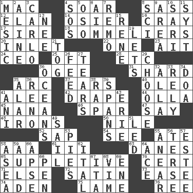 ACROSS 1. Big _ 4. Fly high 8. Backtalk 12. Style 14. Flexible twig of a willow tree 16. Supercomputer manufacturer 17. Beget 18. Wine waiters 20. An arm off of a larger body of water 22. Single 23. Small island 24. Corporate head (abbr.) 25. Often (poetically) 28. And so on (abbr.) 30. Double curve, resembling the letter S 31. Broken piece 35. Curve 37. Hearing organs 40. Butter sub 41. Toward shelter 42. Window treatment 44. Rounded earthenware pot or jar 45. Nanny 46. Practice fight 47. Declare 48. Metal shackles 50. Mediterranean tributary 52. Plant excrement 54. Perceive with the eye 55. Had dinner 58. American Automobile Association (abbr.) 61. One more than two 63. Natives or inhabitants of Denmark 65. Supplementary 70. An absolute certainty 71. Otherwise 72. Smooth fabric 73. Comfort 74. An important port of Yemen 75. Unable to walk 76. Portuguese money of account (variant) DOWN 1. Of or pertaining to a meson 2. Place in a line 3. Monte _, Las Vegas Hotel/Casino 4. Distress signal 5. Bear (Spanish) 6. Direct toward a target or goal 7. San ____ (Riviera town) 8. _-fi 9. Type of rug 10. Indian skirt 11. System (abbr.) 13. Born 15. French philosopher Descartes 19. Allows 21. Coat; cloak 26. Nourish 27. Pulls apart 29. Opt 30. Seas 32. Silent film actress Nazimova 33. Depend 34. ___ good deed 35. Having or resembling wings 36. Western Nevada city 38. Hit sharply and swiftly 39. Connects, as a bridge 41. Cuckoo 43. One of the Great Lakes 49. Travel by water 51. Directed 53. Sliced desserts 55. Approach 56. Laconic 57. First name in cosmetics 58. At sea 59. Old (Scot.) 60. Domed church section 62. Slanted text style (abbr.) 64. Adept person 66. Animal enclosure 67. Call ___ day 68. Zeal 69. Compass dir.