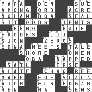 ACROSS 1. Dad 5. Lair 8. Take to court 11. Amid 13. Globe 14. Measure of real estate 15. Pitcher Ryan 16. ___ good deed 17. Lick closed 18. Be seated 19. Probability 21. Portable shelters 22. San ____ (Riviera town) 24. Assign a rank or rating to 25. Eats (away) 27. Cards in a Roman deck? 29. The Jewish people; Israel 30. Nothings 32. Pulitzer Prize-winning author Ferber 33. Confronts 35. Lie 39. Dinah or Pauly 41. Sign of something about to happen 42. Chief or king in Benin or Nigeria 43. Slept 45. Move on water 48. Celtic language 49. Having winglike extensions 50. US Secretary of Labor Elaine L. _ 52. Portuguese money of account (variant) 55. Female horse 56. Enemy 57. Any of the three canals of the cochlea 59. Tiny particle 60. Raised railways 61. _ Allan Poe 62. Layer 63. Floor protector 64. Elected reps. DOWN 1. Zero-star reviews 2. Mine, in Marseilles 3. Characterized by complete cowardliness 4. Santa ___, CA 5. Texas town _ City 6. Greek god of love 7. Basketball assoc. 8. Odor 9. A salt of uric acid 10. Snakelike fish 12. Dwarf 14. Toward the sea 20. Two (Sp.) 21. Musical group of three 23. Ferber et al. 25. Compass dir. 26. To free from 27. Allow 28. Big collection agency 30. Last letter of the English alphabet 31. Constricts 33. Disorderly crowd 34. Period 36. Electrical Measurement 37. Area sheltered from the wind 38. Conclude 40. Hollow 43. Teachers' org. 44. Came up 45. Schedule 46. Composer Copland 47. Detail 49. Housemaid 50. Root beer relative 51. Command 53. Liveliness 54. Hearing organs 56. Opposite of masc. 58. Music discs