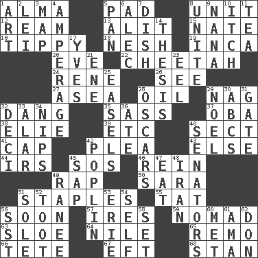 ACROSS 1. _ mater 5. Writing tablet 8. A single undivided whole 12. 480, 500 or 516 sheets of paper 13. Came down and settled, as after flight 15. Nathan's nickname 16. Likely to tip or tilt 18. Delicate 19. South American Indian 20. Night before a holiday 22. Leopard's kin 24. French philosopher Descartes 26. Perceive with the eye 27. Toward the sea 28. Lubricate 29. Tired old horse 32. Mild oath, euphamism for damn 35. Backtalk 37. Chief or king in Benin or Nigeria 38. Writer Wiesel 39. And so on (abbr.) 40. Religious group 41. Head covering 42. Entreaty 43. Otherwise 44. Big collection agency 45. Distress signal 46. It's straight from the horse's mouth 49. Reproach for some lapse or misdeed 50. "Two Mules for Sister ____" 51. Paper fasteners 55. Make lace 56. Within a short period 57. Angers 59. Roamer 63. _ gin 64. The longest river in the world 65. San ____ (Riviera town) 66. Wig 67. Newt 68. Comedian Laurel of Laurel & Hardy DOWN 1. Nonscientific branch of learning 2. Luau accessory 3. Atlas unit 4. Electrical Measurement 5. Baking dish 6. Actor Baldwin 7. Food container 8. Join together 9. Nanny 10. Hankering 11. Afternoon social gathering 14. College paper 17. Jacques Cousteau's middle name 21. Compass dir. 23. Snakelike fish 25. Artist's stands 28. Motion picture awards 29. Christmas carol 30. Lettered men learn these first 31. Yard entry 32. Tenth: prefix 33. Having or resembling wings 34. Cuts off 36. Had dinner 40. Elected representatives 42. Cotton for raincoats, e.g. 45. Plant excrement 47. Consume 48. SW Asia republic 49. Indian princess (variant) 51. Not divided or shared with others 52. A blast of a horn 53. One of the Great Lakes 54. Oneself 56. Fast jet (abbr.) 58. Put into a specified state 60. Was introduced to 61. Wet nurse (var.) 62. Spanish title