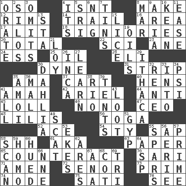 ACROSS 1. Bear (Spanish) 4. Is not 8. Create 12. Basketball hoops 14. Hang back 16. Type of rug 17. Came down and settled, as after flight 18. Seigniories (variant) 20. "_____ Recall" 22. _-fi 23. One (Scot) 24. Double-curved letter 25. Petroleum 28. Biblical high priest 30. Centimeter-gram-second unit of force 31. Empty completely 35. Nanny (var.) 37. Draw slowly or heavily 40. Coop moms 41. Nursemaid 42. Satellite of Uranus 44. Opposed to 45. Hang loosely or laxly 46. Words to Nanette 47. Corporate head (abbr.) 48. Ms. Damita and namesakes 50. Ancient Roman robe 52. Adept person 54. Filthy place 55. Plant excrement 58. Quiet! 61. Alias (abbr.) 63. Some stationery 65. Frustrate 70. Indian skirt 71. So be it 72. Sir (Sp.) 73. Demure 74. Thickened enlargement 75. Suttee (variant) 76. Observe DOWN 1. Speak pompously 2. Grain storage towers 3. Leaves out 4. It is 5. _ Lanka 6. Tired old horse 7. Airtight sealed metal containers 8. Spoil 9. Roberta Peters solo 10. Peachy ____! 11. Relaxation 13. R.R. building 15. Louse (plural) 19. Petroleums 21. Myrna of the movies 26. South American Indian 27. Acquire or gain knowledge or skills 29. New York city 30. Mexican or Central American flower 32. French philosopher Descartes 33. To the inside or interior of 34. Air pressure measure (abbr.) 35. Mine, in Marseilles 36. Promenade 38. _ de Janeiro 39. Portable shelters 41. Everything 43. Plunder 49. Scram, to a cat 51. Con 53. Supplements with great effort 55. Practice fights 56. Nest on high 57. A-one 58. Glance over 59. Same (prefix) 60. Became colored 62. Ancient Greek god of war 64. Cleo's killer 66. Compass dir. 67. Santa ___, CA 68. Small bed 69. Three (prefix)