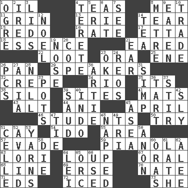 ACROSS 1. Petroleum 4. Beverages made from leaves 8. Was introduced to 11. Smile widely 13. One of the Great Lakes 14. Lacerate 15. Redecorate 16. Pace 17. Singer James 18. Center 21. Having ears or earlike features 22. Spoils 23. Mouth or opening 25. Compass dir. 26. Baking dish 29. Orators 32. Streamer paper 34. _ de Janeiro 35. ___ a Wonderful Life 38. Grain storage tower 39. Settings 41. Floor coverings 43. The first octave above the treble staff 44. Black tropical American cuckoo 45. Showery time 46. SAT takers 50. Attempt 51. Island 54. Wedding promise 55. Type of rug 57. Elude 59. Player piano 63. Australian parrot (variant) 64. Central Nebraska county 67. Of the mouth 68. Actor's bit 69. Celtic language 70. Nathan's nickname 71. Begley and Asner 72. On the rocks 73. A female animal or person DOWN 1. Legendary monster 2. Angers 3. Flaplike coverings 4. Cigar-shaped 5. Period 6. Small island 7. Perceive with the eye 8. Distance measurement (Brit.) 9. Ingested 10. Buy and sell 12. Christmas carol 14. Beverage made from leaves 19. Characteristic smell of wine 20. Police officer (slang) 21. Hearing organ 23. Migrant worker of the '30s 24. Vintage cars 26. Personal Computers (abbr.) 27. Operatic vocal solo 28. 1994 drama film starring Jodie Foster 30. Nick name for Arthur 31. Simple or foolish person 33. Cooking vessels 36. Small pie 37. Move through with a circular motion 39. Saudi Arabian king (1953-1964) 40. _ china 42. Roguish 45. At sea 47. Make a knot 48. Slept 49. Three (prefix) 51. Cell (Danish) 52. Prevent the occurrence of 53. Tall tales 56. At once, immediately (arch.) 58. Pass on 60. Mouths or openings 61. Thin strip of wood or metal 62. Toward shelter 64. Flowery wreath 65. The grampus (Milton) 66. Purpose