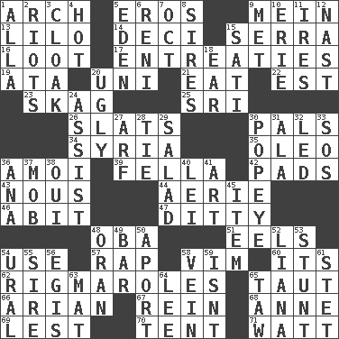 ACROSS 1. Bowlike part 5. Greek god of love 9. Count _ (2 wds.) 13. _ and Stitch 14. Tenth: prefix 15. Father Junipero _ 16. Plunder 17. Pleas 19. "One Day ___ Time" 20. Single; one (prefix) 21. Ingest 22. Eastern Standard Time (abbr.) 23. Heroin 25. _ Lanka 26. Narrow boards 30. Friends 34. Damascus' land 35. Margarine 36. Mine, in Marseilles 39. Man or boy (slang) 42. Writing tablets 43. Common sense 44. Nest on high 46. "This won't hurt ____!" 47. Simple song 48. Chief or king in Benin or Nigeria 51. Snakelike fish 54. Purpose 57. Reproach for some lapse or misdeed 58. Zeal 60. ___ a Wonderful Life 62. Frustrating wastes of time 65. Pulled tight 66. Believer in; advocate of (suffix) 67. It's straight from the horse's mouth 68. Queen of England 1702-14 69. For fear that 70. Portable shelter 71. Electrical Unit DOWN 1. Silent film actress Nazimova 2. Disturbances 3. Cover or conceal 4. Being at a high temperature 5. Locale of original sin 6. Painter Guido (1575-1642) 7. Sep. follower 8. Begets 9. Was introduced to 10. 4th largest of the Great Lakes 11. Angers 12. Political cartoonist Thomas 15. Suttee (variant) 18. Hearing organ 20. Repulsive 24. Aid 27. Sandy's bark 28. Make a knot 29. Vegetable dish 30. Wimpy's pal 31. According to 32. Directed 33. Mayday 36. Santa ___, CA 37. Disorderly crowd 38. Fr. "Yes" 40. Luau accessory 41. Tate display 45. A distinct part 48. Northwest Algerian city 49. Drinking establishment 50. To the left, to Queeg 52. Climbing, woody, usually tropical vines 53. Difficult or unusual or dangerous feat 54. Mountain range 55. Male parent of an animal 56. The front part of a cuirass 58. Distinctive style or manner 59. Is not 61. Proofreading order 63. Floor covering 64. Area sheltered from the wind 65. The 23rd letter of the Hebrew alphabet